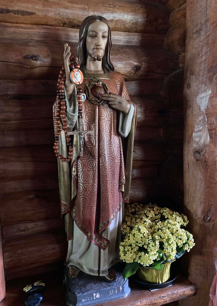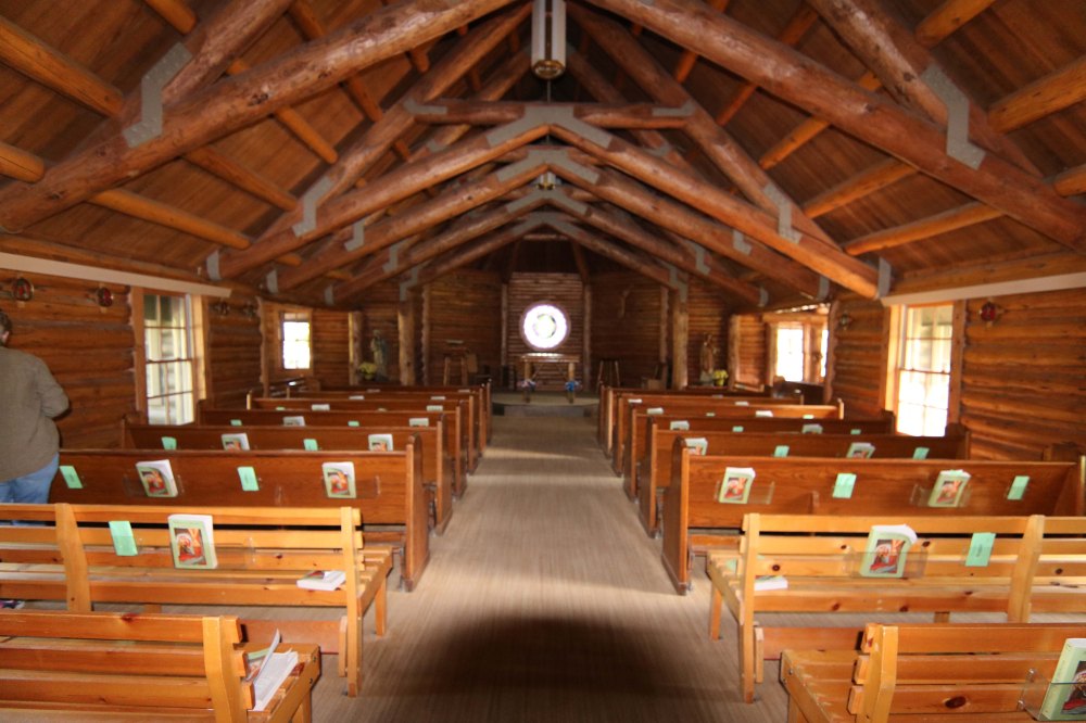 Next we stopped at a beautiful Catholic Church. We love seeing old churches in our travels and the Chapel of the Sacred Heart (built in 1937) was beautiful. The altar and stained glass window faced the mountain view and the inside wooden artwork was equally beautiful.