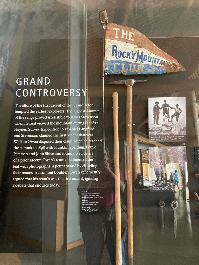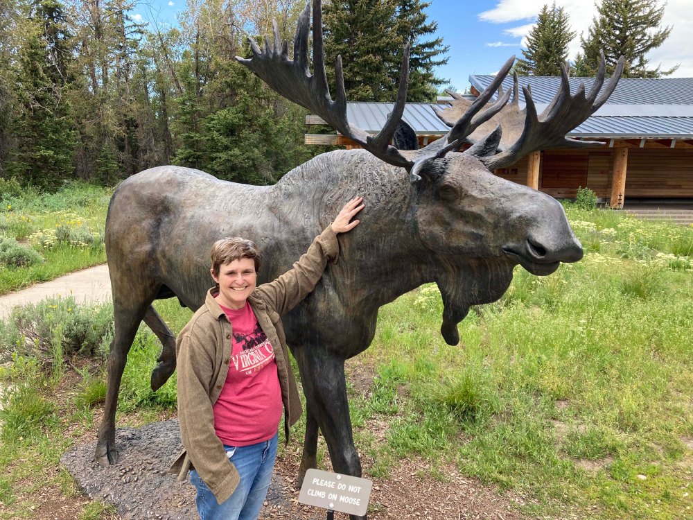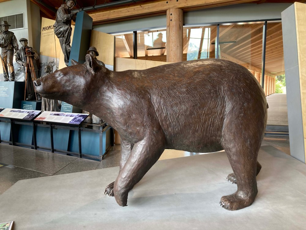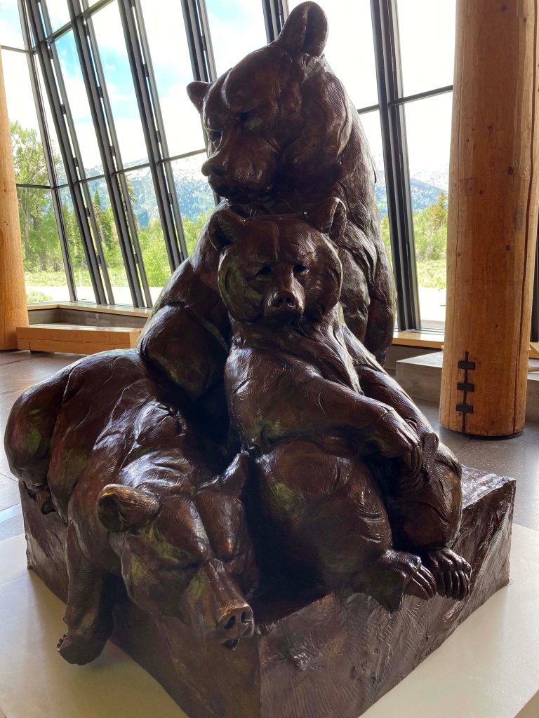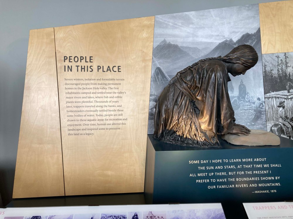 Finally we arrived at the Craig Thomas Visitors Center and it was really terrific. One of the best I have seen in any National Park and again huge glass windows looking out on the mountains. I particularly liked that the park was focused on the various people who lived and traveled here and had cool iron statues of many of them. Beautiful building, fantastic giftshop (although really pricey) and great exhibits.