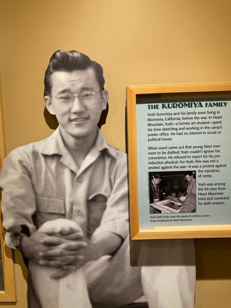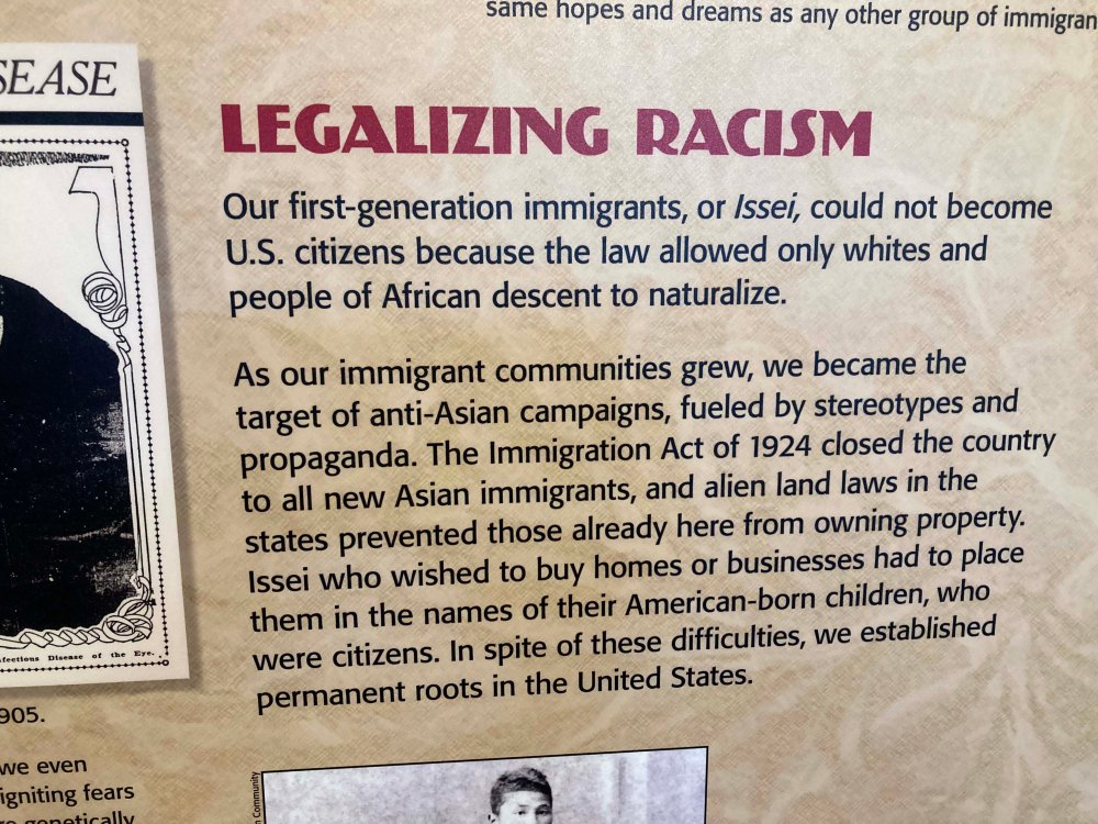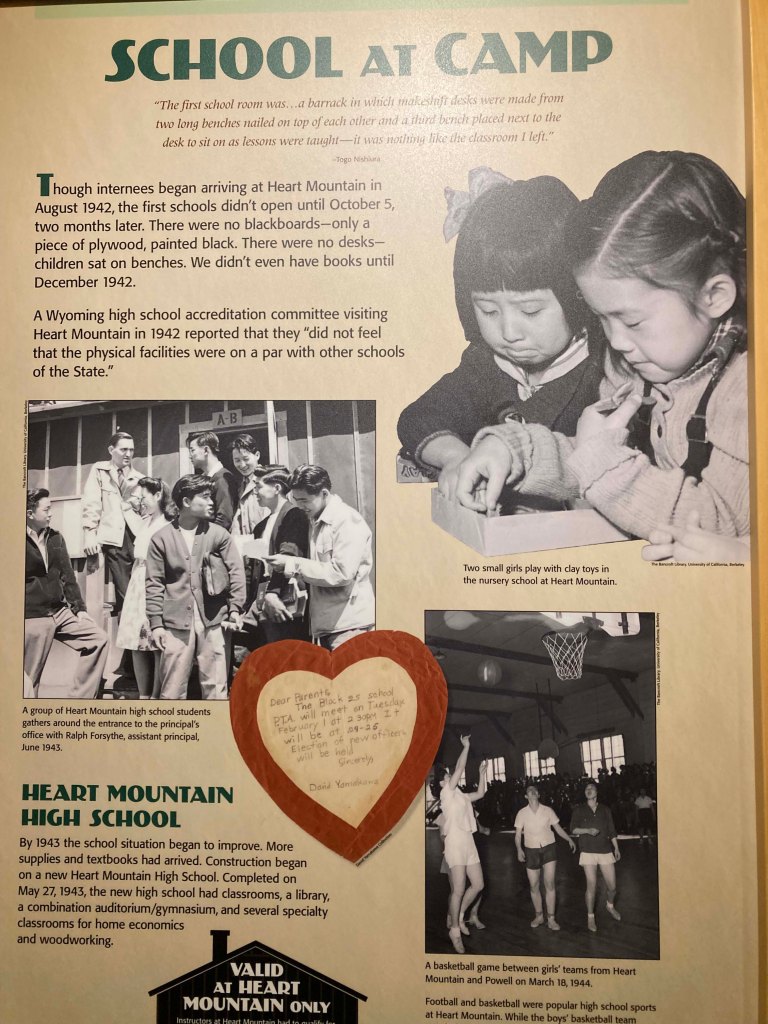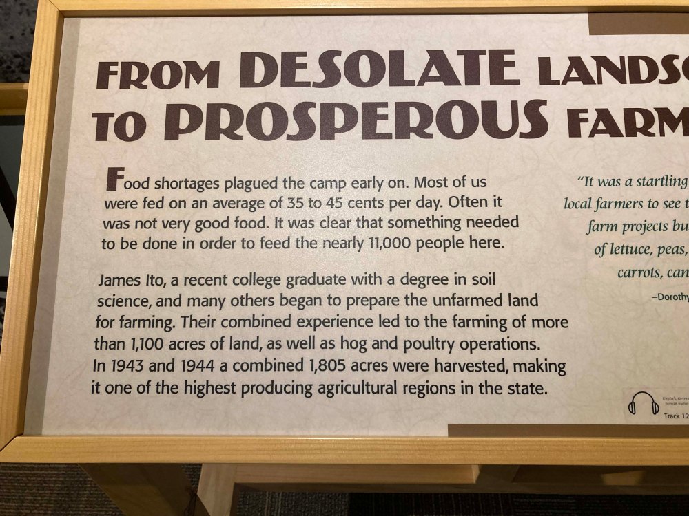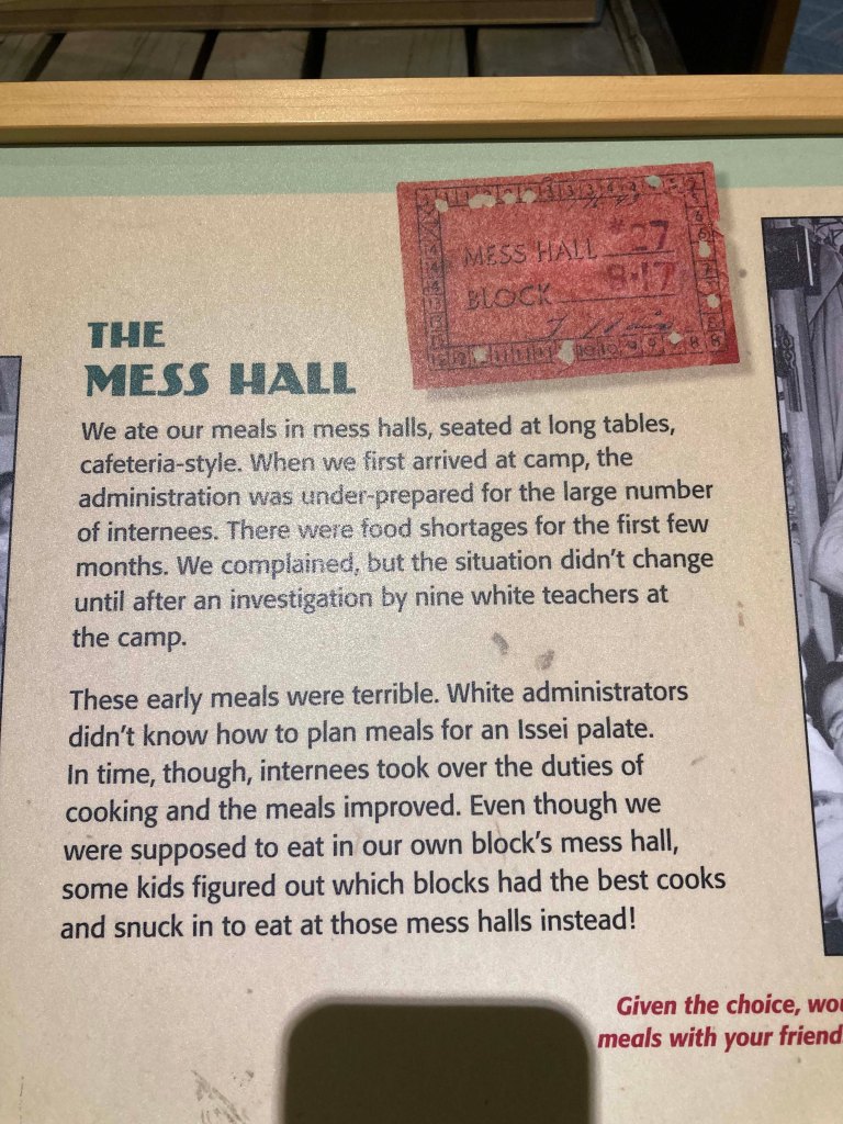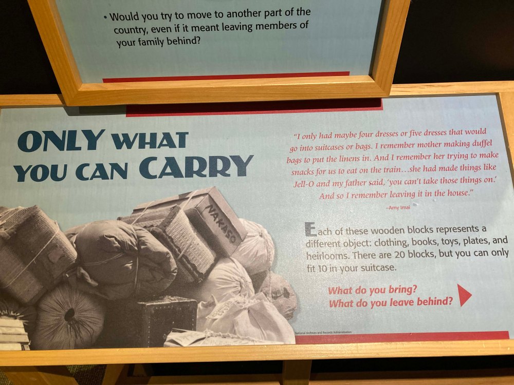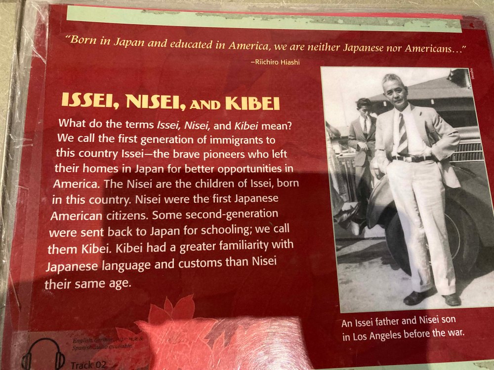 The displays were very well done and many of the quotes were first hand accounts by the children that were there. One thing I did find confusing was the reference to the Issei, Nisei, and Kibei. In our hurry I had missed the display that explained these were generational terms. The Issei were immigrants from Japan, Nisei were first generation American citizens, and the Kibei were second generation who were sent back to Japan for schooling. These groups were treated very differently and since the Nisei and Kibei were younger this went against the Japanese traditions of elders being community leaders.