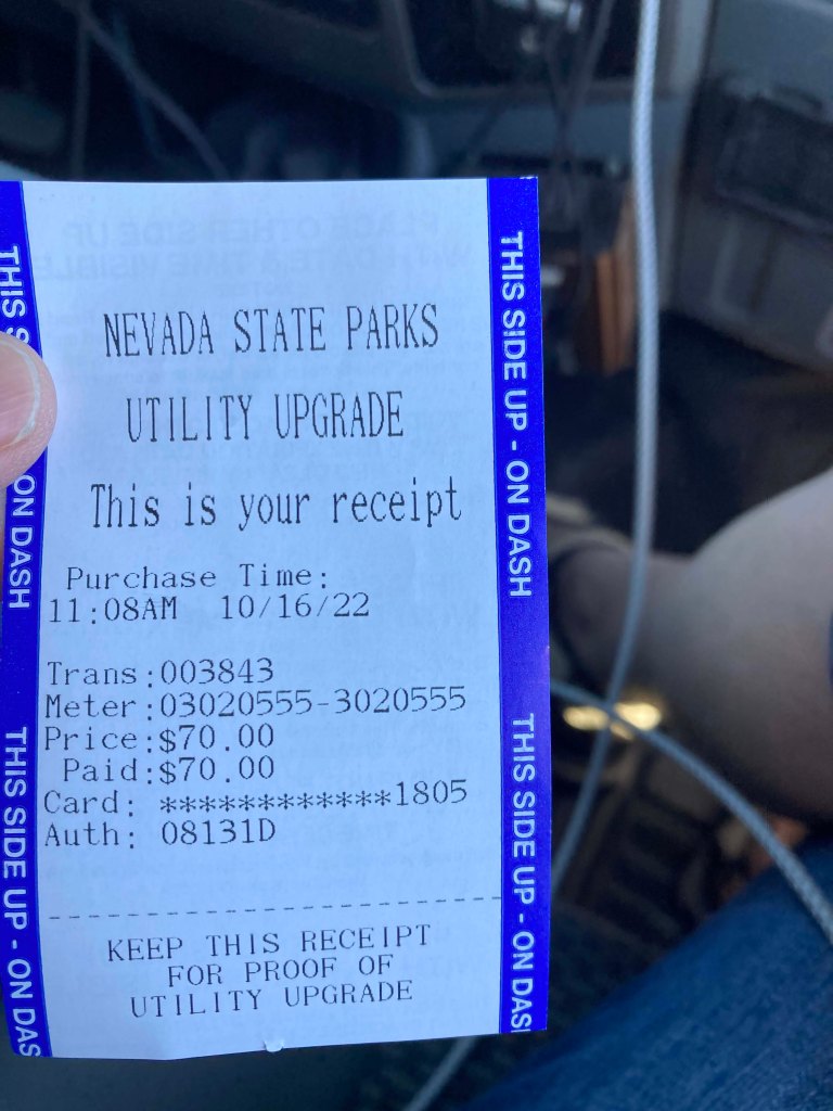 The campground itself has 50 amp electric and the cost per night is $20 + $10 for electric. We had heard about the Nevada annual parks pass so after unhitching we went up to the visitors center to ask about it. Turns out for $250 you can get unlimited camping in Nevada Parks for no additional charge, and for electric sites only have to pay $10 a night. You also get free entrance to all the parks (another $10 for out of state day use) so after doing the math and figuring out 14 days would better than break even we bought the pass.