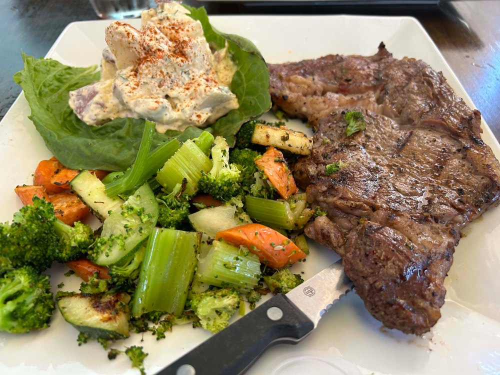 Local rancher ribeye, local vegetables, local salad, and fantastic homemade potato salad for $33!!!