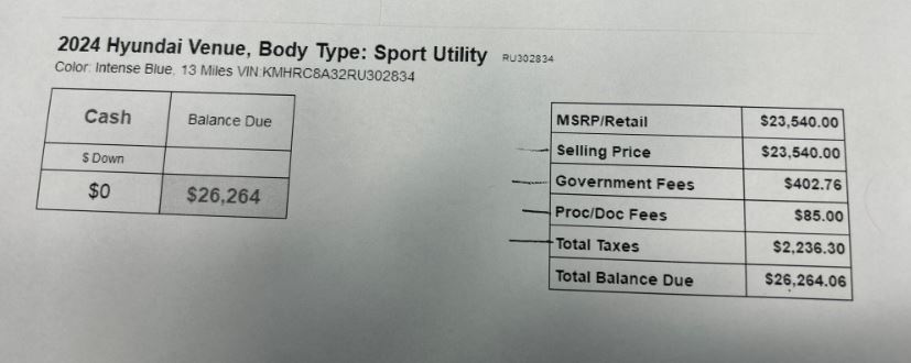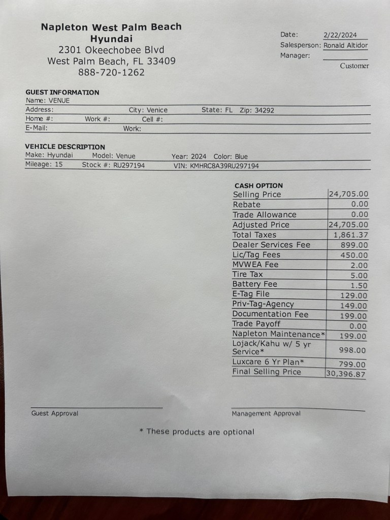 Even though the taxes were a little more expensive the lack of a million other fees more than made up for it. At this point I jettisoned the idea of getting it from Florida and instead we started to explore just getting the vehicle registered here. Part of that was the Florida dealership refused to go below $27K and part of it was these folks were much nicer to deal with. I have been buying Hyundai’s since 2000 and like most of their dealerships and this was a good one.