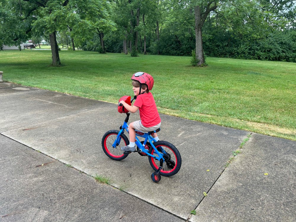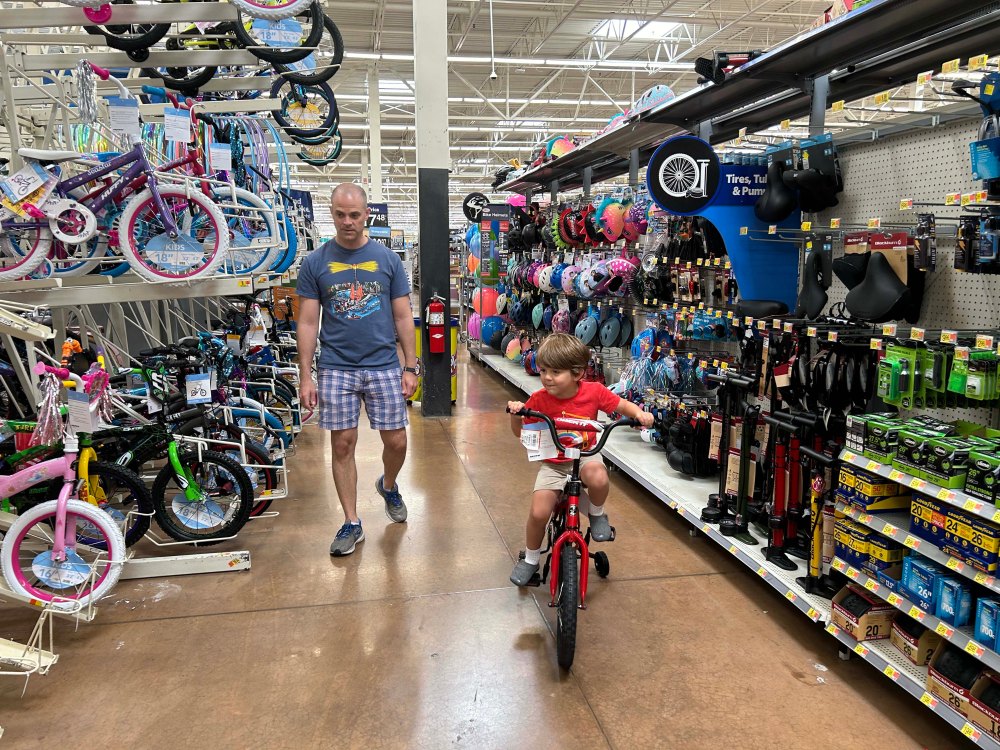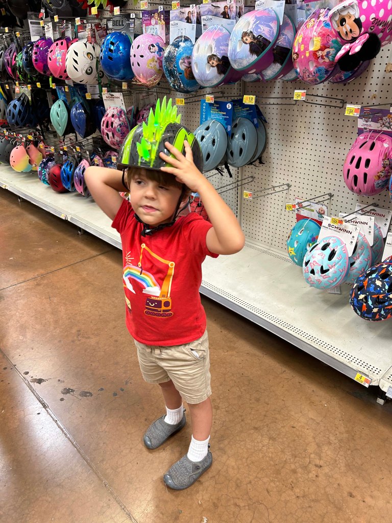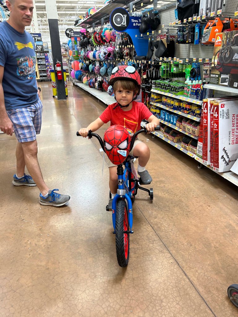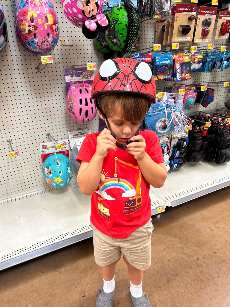 On the third visit day though I decided more toys were in order and since his birthday was only a month away Jeremy and I went to buy him his first big boy bike. He has never been on a bike before but jumped on and rode it right away. Not knowing how to brake was a bit of a problem in the store but we managed to pick a bike and even harder a helmet. We tried on several but eventually he picked the Spiderman helmet which matched his Spiderman bike.