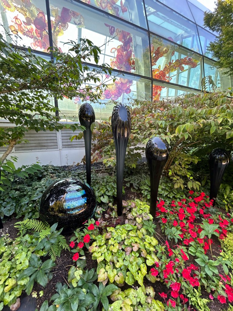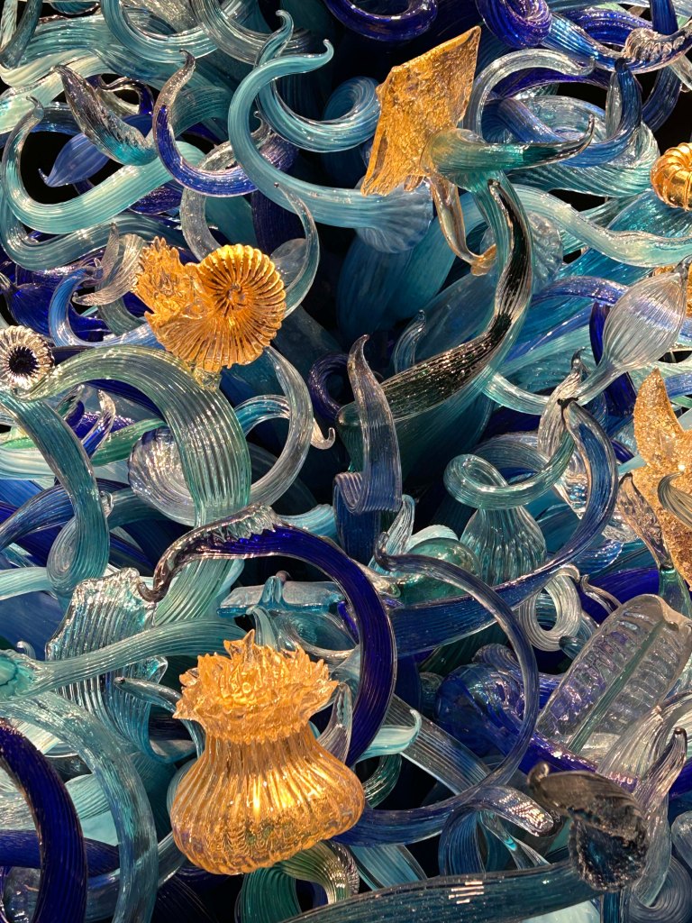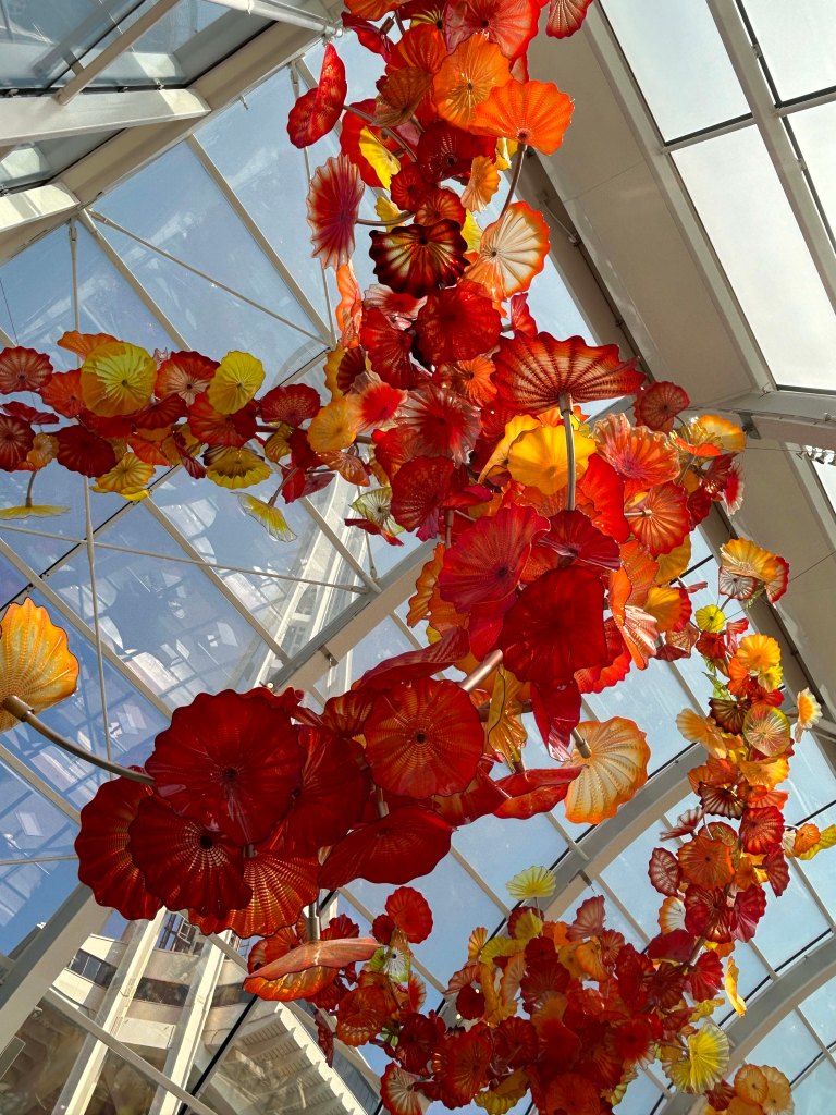I almost talked myself out of it, crazy how often I try to do that. It was a travel day and the Uber was too expensive, but then I gave myself a mental shake and off I went. And oh how glad I was. I couldn’t begin to capture the beauty or intricacy of the glass I saw, but I will tell you that when a small Chihuly bowl goes for a couple of grand, there is hundreds of thousands dollars worth of sculpture in this space. Plus it is at the base of the Seattle Space Needle and the views were a huge bonus. I don’t know if you will get my experience from the pictures I took, but I am so glad I checked this bucket list item.