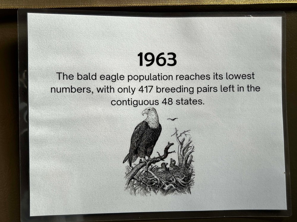 Aside from the numerous stuffed animals they did have a few birds that were rescued. Seeing an eagle in a cage is definitely not the same as seeing them in the wild, but I do appreciate the work they are doing. They also had some wonderful information on the history of Eagles. In 1963 we were down to 417 breeding pairs now we have 316,000.