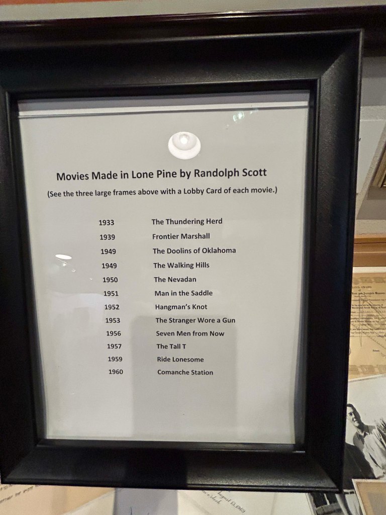 The amount of westerns shot here was amazing. Over 100 years, 700 films were shot here. In particular it was a favorite of Randolph Scott and he shot most of his movies here. If you haven’t heard of Randolph Scott he was the John Wayne of his time. Along with him are folks like Tom Mix and really every Western star you could think of shot here at one time or another. If you want something more recent they shot part of Django Unchained here and even had Quentin Tarantino’s director’s chair.