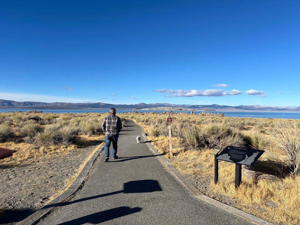 There are several entrances (some by foot and others by car) but it just wasn’t clear which way to go. Finally we looked at the big map outside the visitors center and with a little bit of luck we found the entrance. The parking lot has a day use fee but with our National Parks pass it was free to us. There was a fantastic wooden boardwalk that was Jack friendly and we started walking down towards the lake. The closer we got we saw signs showing where the lake was in certain years and started seeing the rock formations.