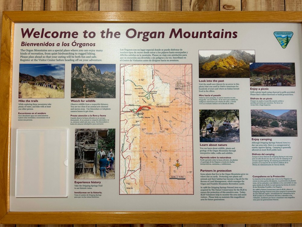 Our first stop in our Travel 2.0 route was Organ Mountains-Desert Peaks National Monument. It’s about 30 minutes from Las Cruces and the drive to get to our campground was along some beautiful scenic road. The Monument has a nice little visitor’s center, along with some hiking trails. We took a weekend day to visit and walk some trails and were excited to find a really cool cave along the way.