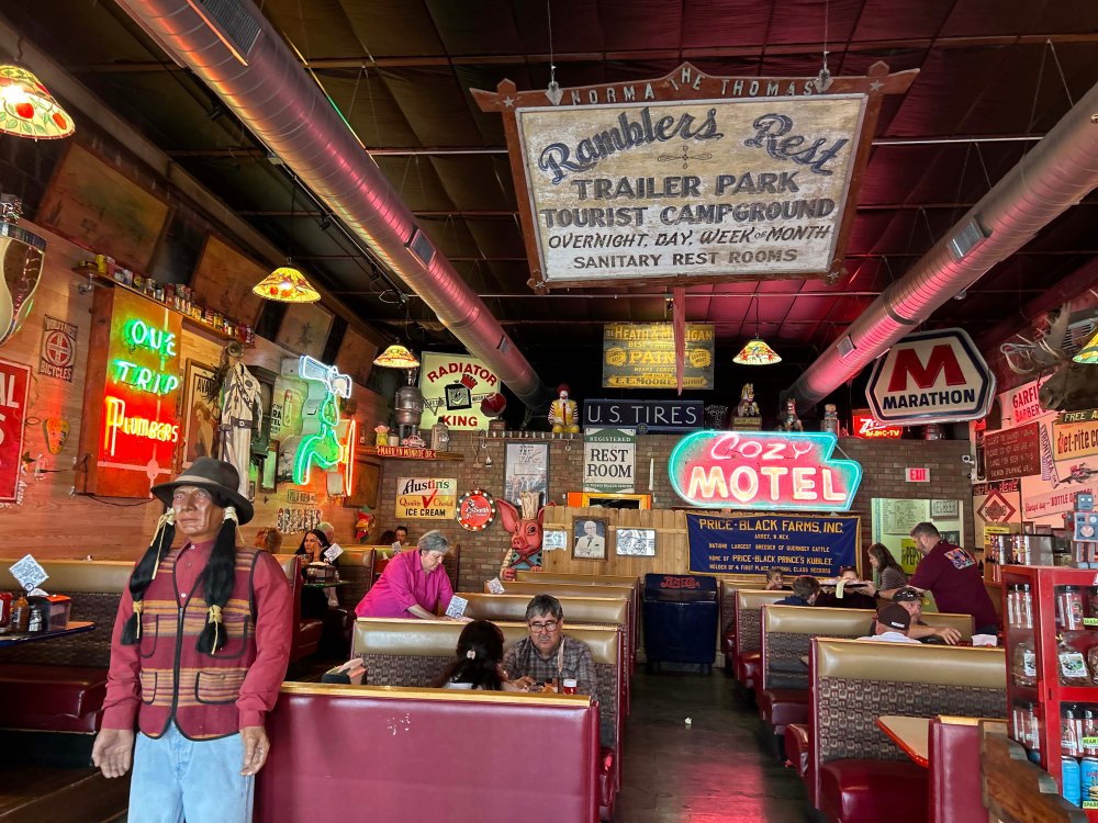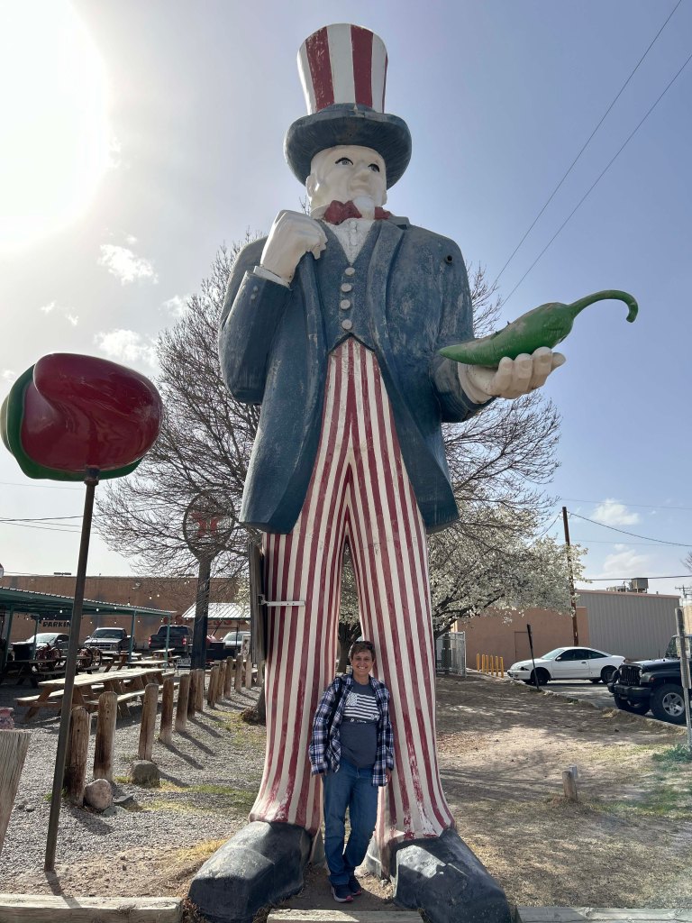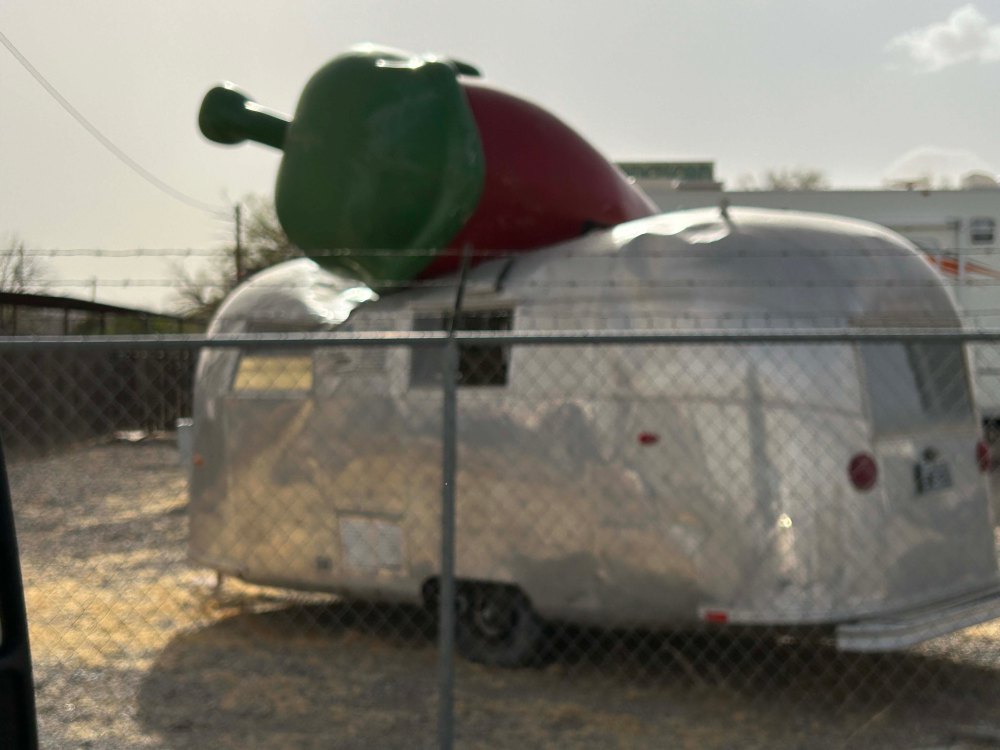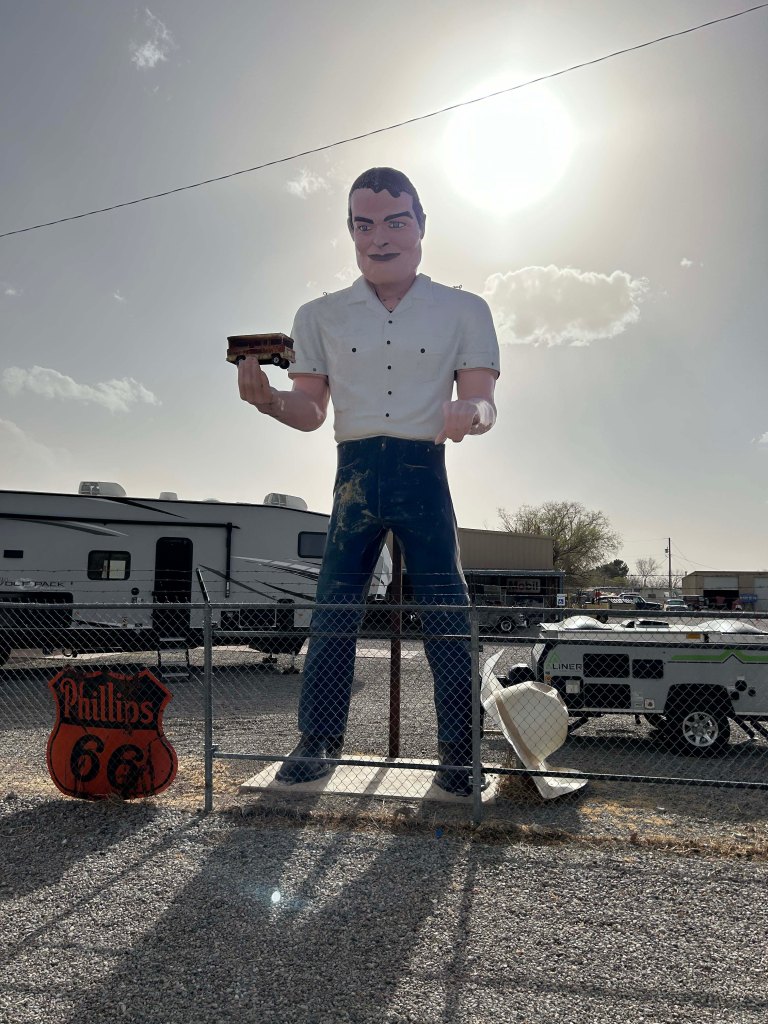 Lee’s absolute favorite was at an RV park down the street with a giant “Muffler Man” holding a small RV and an “airstream” crushed by a giant pepper. Very cool.