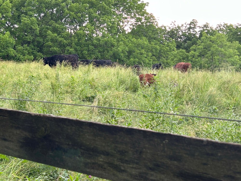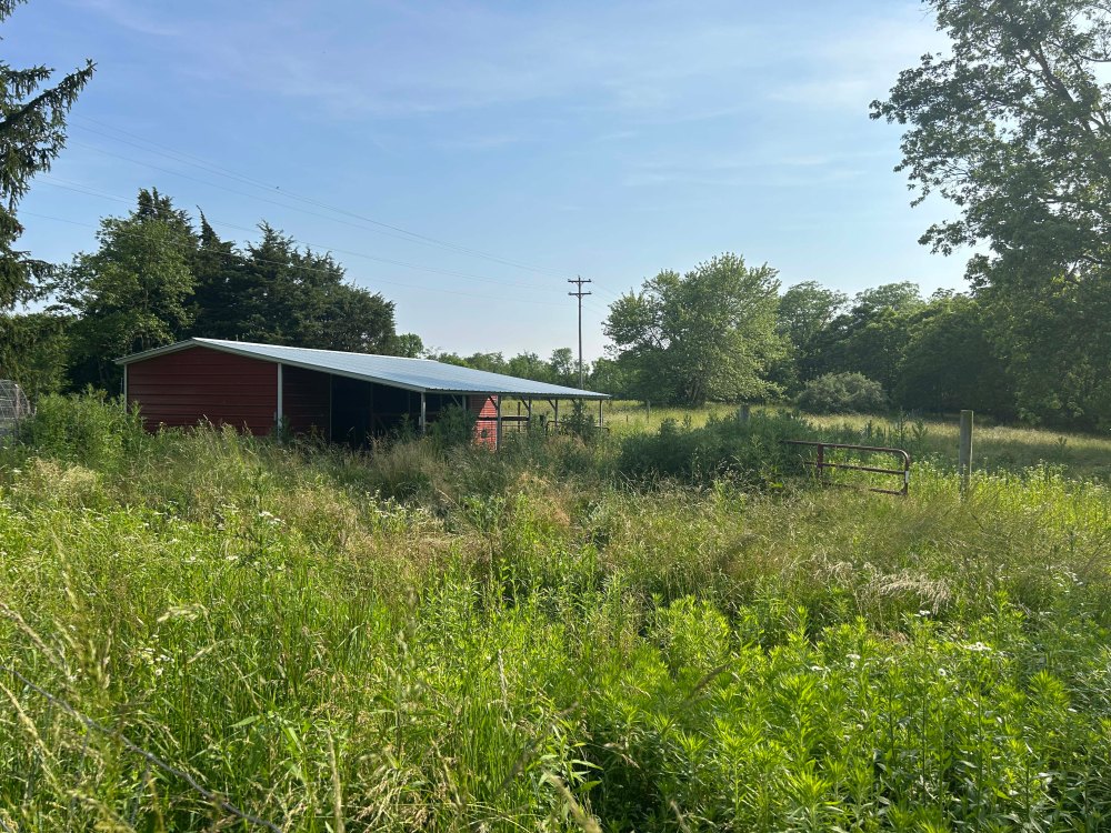 The garden is to the left of the barn, off camera. The barn has two stalls and there is even a standalone hay/straw tent on the property. Our property goes past those trees way at the end of the grass. Past the telephone pole you can see in the picture. It’s narrow but deep.