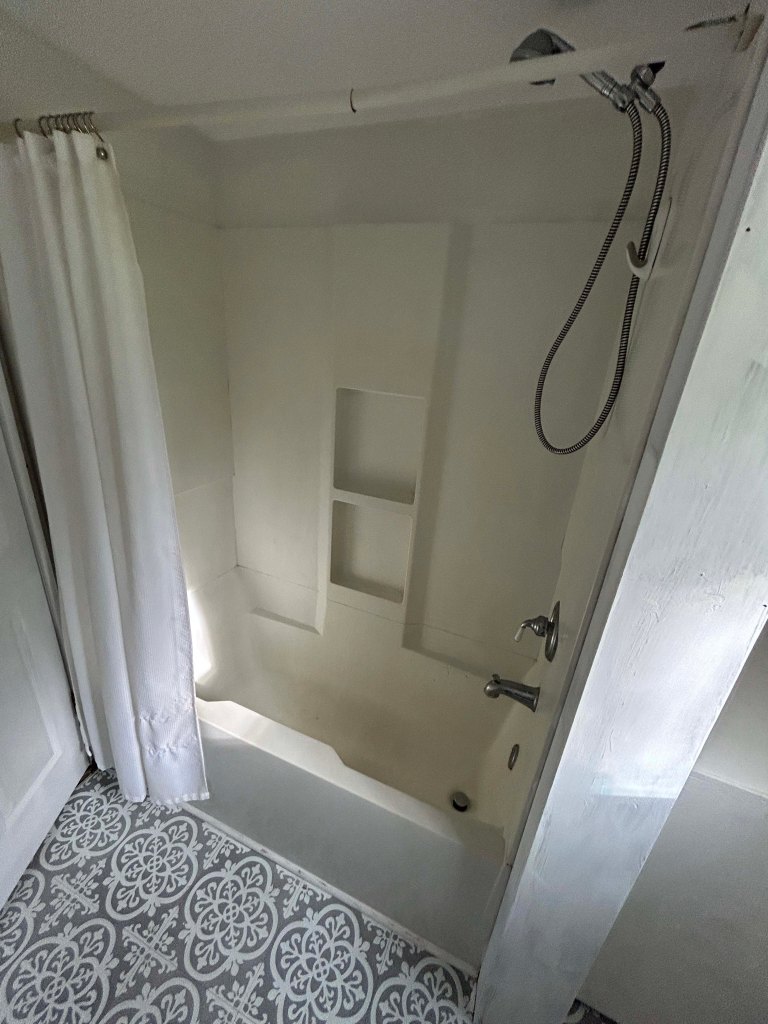 Around the corner to the right are three bedrooms and a bath with a deep tub. For the age of the house it’s not a bad shower, but the rooms are on the small side. I am taking the back facing room for my office and Lee is taking the front for his. We talked about having a dedicated guest room, but we both are really looking forward to our own space after all those years of sharing in the RV.