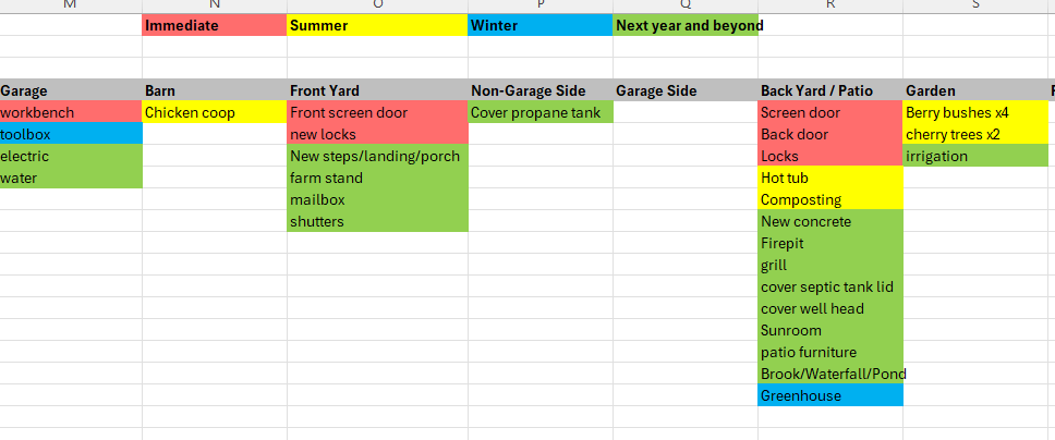 One of my major complaints is they (poorly) slapped a white coat of paint on everything including the outside. There is a stone front under all that white paint, and we want to see what’s under there. I get it, white paint sells, but they did do a pretty crappy job inside and out. Thankfully Lee is an excellent painter although the painting is slated for the winter. Speaking of that, we made one of our famous spreadsheets, to list the things we needed and what time period we were slating them for. We have a bit of money set aside but obviously you can’t do everything at once. Largely we have stuck to this list, and I am so glad we did this prior to moving into the house. I love a good spreadsheet!