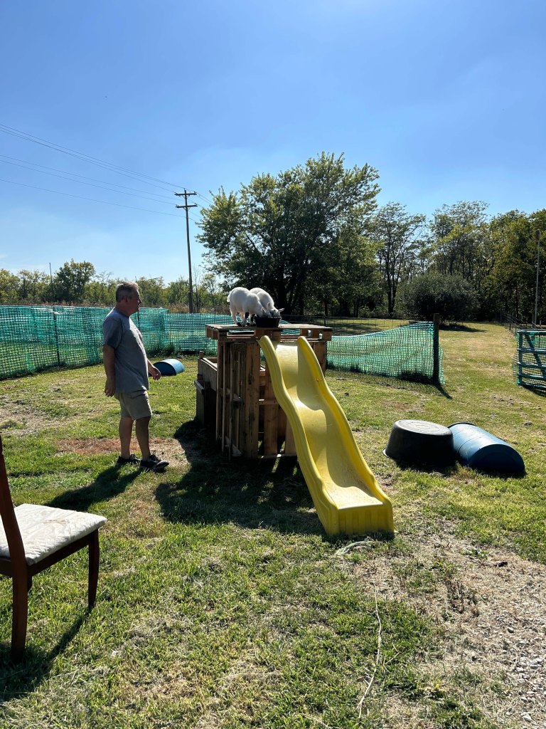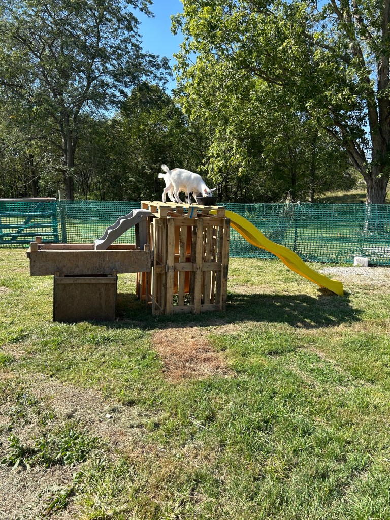 Lee also built them a goat jungle gym and they love playing king of the mountain.