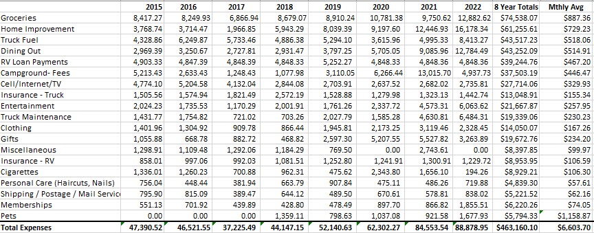 One of the first questions people ask when contemplating the full-time lifestyle is “Can we afford it?”  It’s a good question but not that easy to answer because it really depends on your revenue and budget needs.  When we were researching the lifestyle, there were only a few detailed budgets available to us and I vowed that if we were ever lucky enough to become full timers I would pay it forward by sharing our expenses.  Please keep in mind that starting in Year 2020 I was remotely working a corporate job and we had lots of money coming in.  Our expenses reflect that.  If you are interested in seeing years where we lived on a strict fixed income I would recommend the budgets for 2016 – 2019.