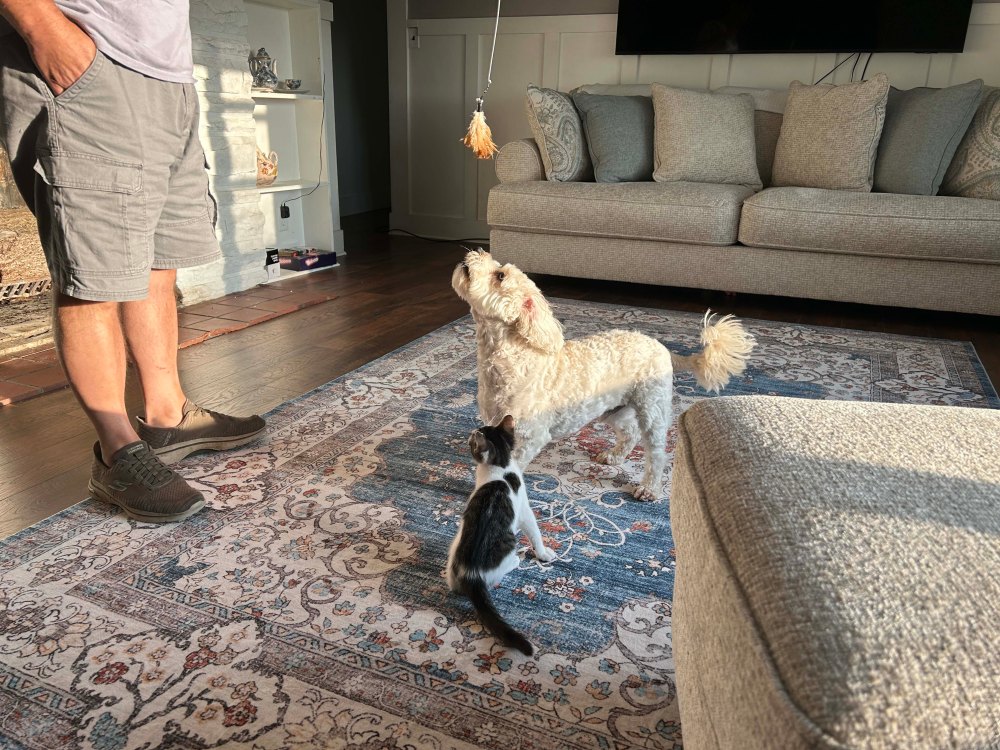 Everyone has their own thoughts about how to work these introductions, but I will say it was ALOT more work than I expected. Part of that is overcoming Jack’s high predator instinct and the other was that the kitten was so small I was pretty worried. Now that’s she’s bigger its less of a concern but frankly I will be glad when she is full sized and on more of an equal footing. Oh, and we named her Moxie, which Jack understands and when are looking for her he will search the house with us and often finds her first and bark to let us know he found her. Another thing I have never seen a dog do 🙂