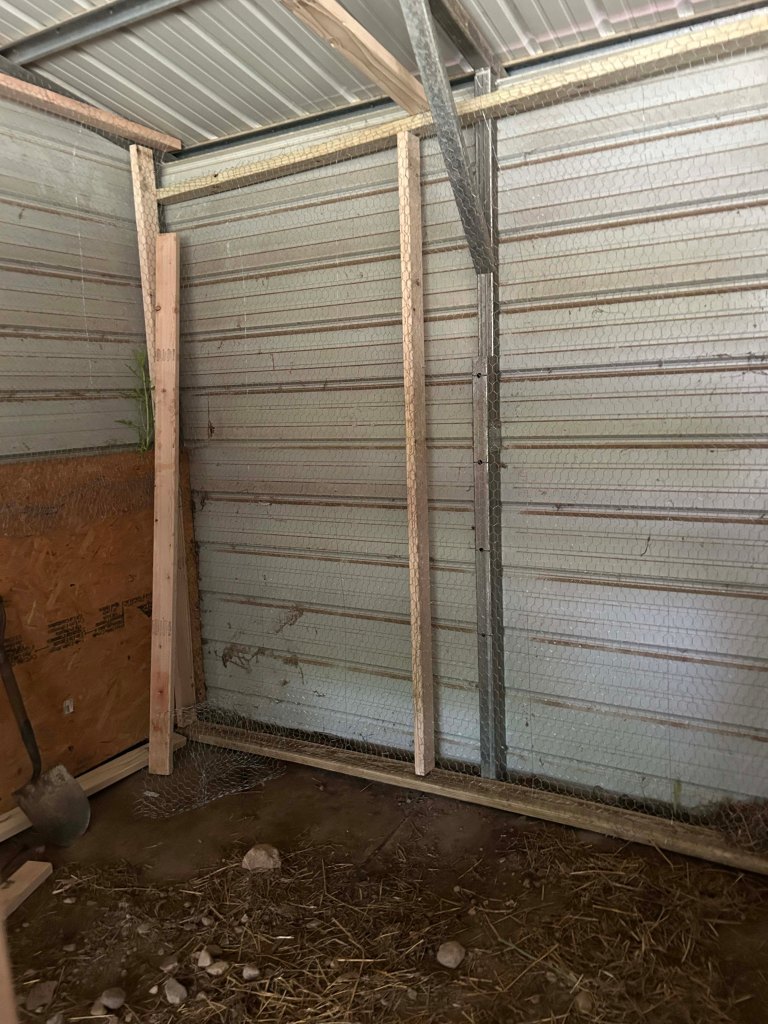Empty stall I raked it out! Tool staging. Lee used the generator to power since we dont have electric in stalls yetLee removed the wood for use somewhere else because it wasn’t neededIt was HOT in that stallAfter much discussion we decided to use a door that was left on the propertyEssentially, he had to frame the entire interior to attach the chicken wire
