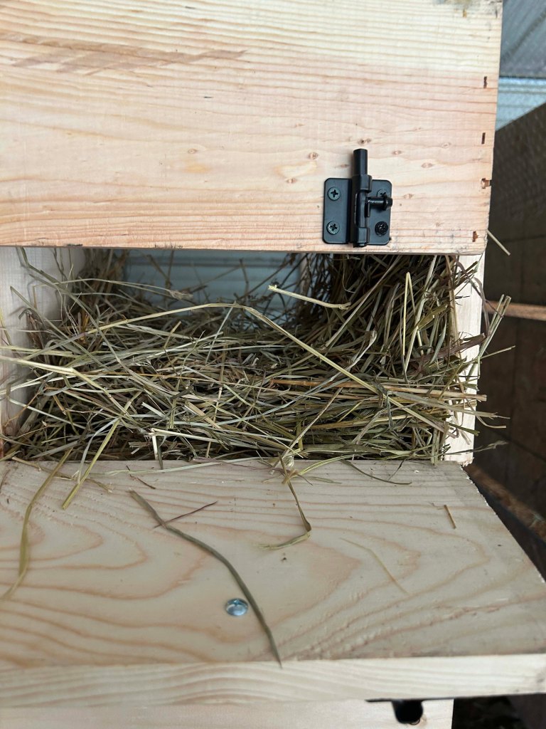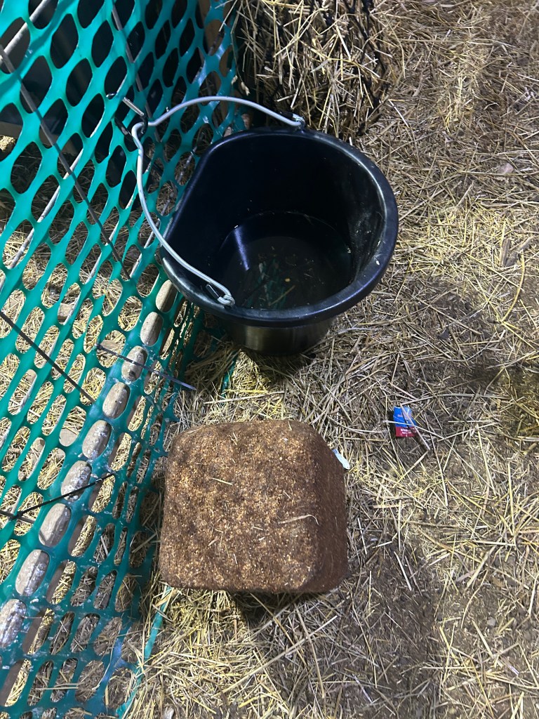 We got home and saw our baby was out and in the chicken area. Thankfully she had stayed close and we put the other three in the stall with her. Immediately two of the new ones got out through a REALLY small hole in the fencing. When I say hole I mean it is part of the fence design and we were both amazed they could wriggle through it, so we piled up straw bales all around to get through the night and went into the house. We have a camera to monitor and the baby threw herself repeatedly against the bars trying to get out but was locked in thankfully. We went out to check them one more time and then went to bed.