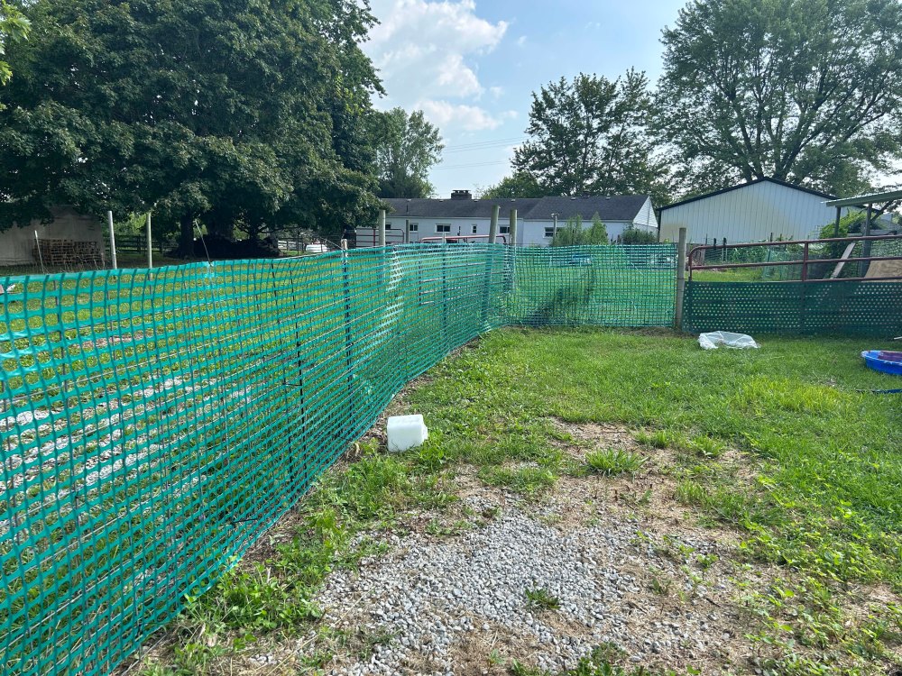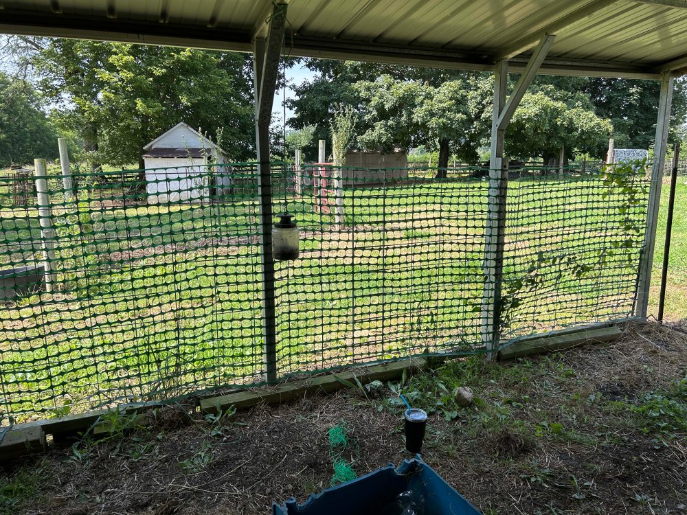 The next morning Lee woke up and went to get snow fencing (not always easy to find this time of year but Menards a local hardware chain we love had it) and then he put that along all the new fence he had just put up the day before. I have to say Lee has put everything on hold to help me fix this problem which is the only thing that make it possible with me working full time. The snow fence stops them from getting through the small holes and has worked on both the chickens and the goats by the way. Also way cheaper and easier than chicken wire although we know it wont really be a predator deterrent. Anyways, Lee got all that up and we were finally able to get them out of the stall. That was of paramount importance because it was going to be another humid 90 degree day and we wanted them to be able to get out of the stall.