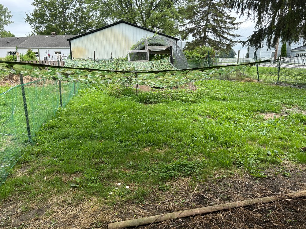 So I had three chickens, a ton of guilt, and needed to get fencing up right away. I was on vacation that week but it was also super-hot so I went out on Monday (Lee was at work) and started using the fencing and snow fence we had laying around to put up some fence. I knew I wouldn’t get it completely done but thought I could start with existing fencing and had some success tying snow fence to it. I didn’t think it would keep predators out but it would keep chickens in and I felt pretty good about the progress I made. Honestly it helped me feel like I was taking control of the situation.