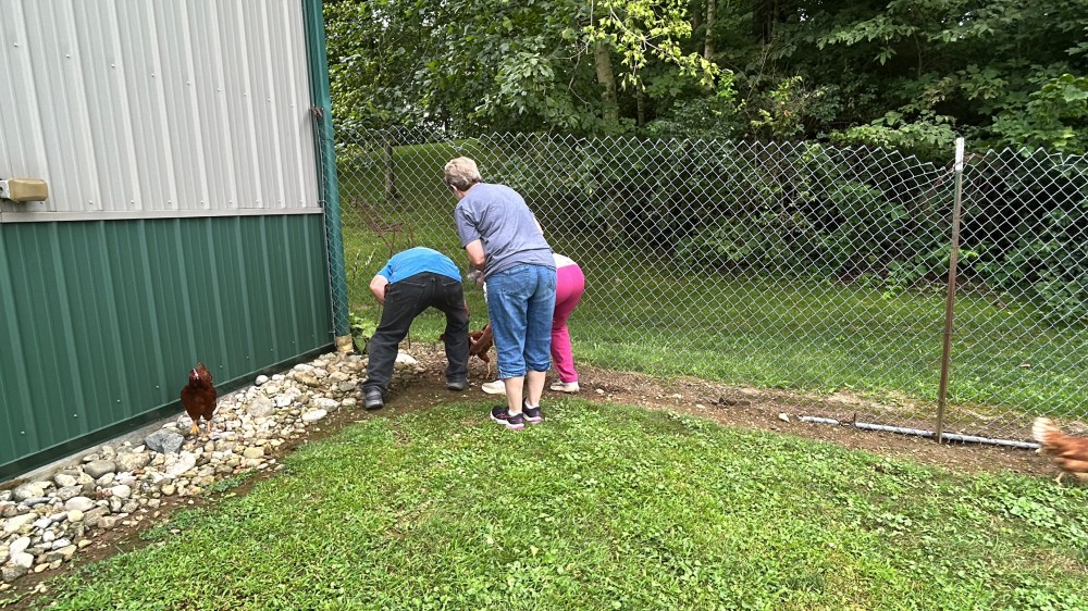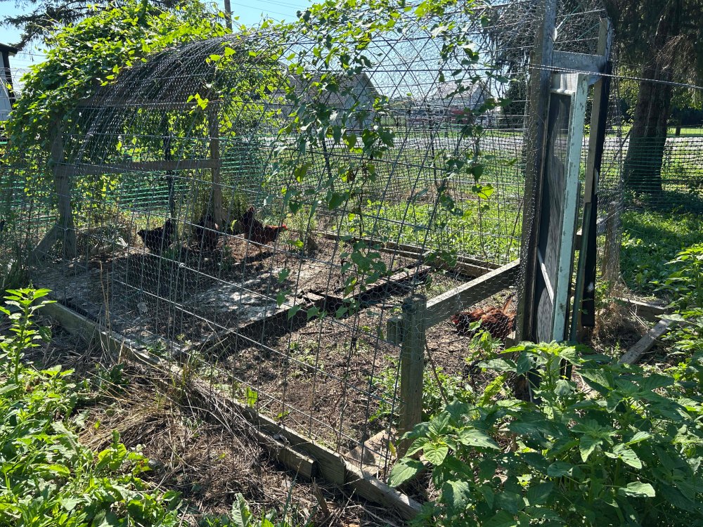 Thankfully though he thought we could finish the fence and the next morning he woke up early to get started. He woke me up with the fantastic news that one of the chickens had “come back to the roost” and was standing outside the coop that morning talking to the other chickens. The chicken miracle got me motivated so I wrapped my ankle and hobbled out to help with the fence. We used a combination of plastic chicken fence (I bought from tractor supply) and various fencing and we finally got the fence done. It was alternately hot as heck or pouring down rain so we had to work around the elements. Also, we kept seeing the fifth chicken standing in our front yard but as soon as we got close to her she would run across the street into the huge soybean field. After one night of standing in the pouring rain, stopping traffic so she wouldn’t get run over, and this nice farm kid getting out of his truck in the pouring rain and trying to help me catch her I was like screw that chicken I am fine with four! Plus with the fence done we could at least open the door to the coop although the traumatized chickens wouldn’t come out very far unless pushed.