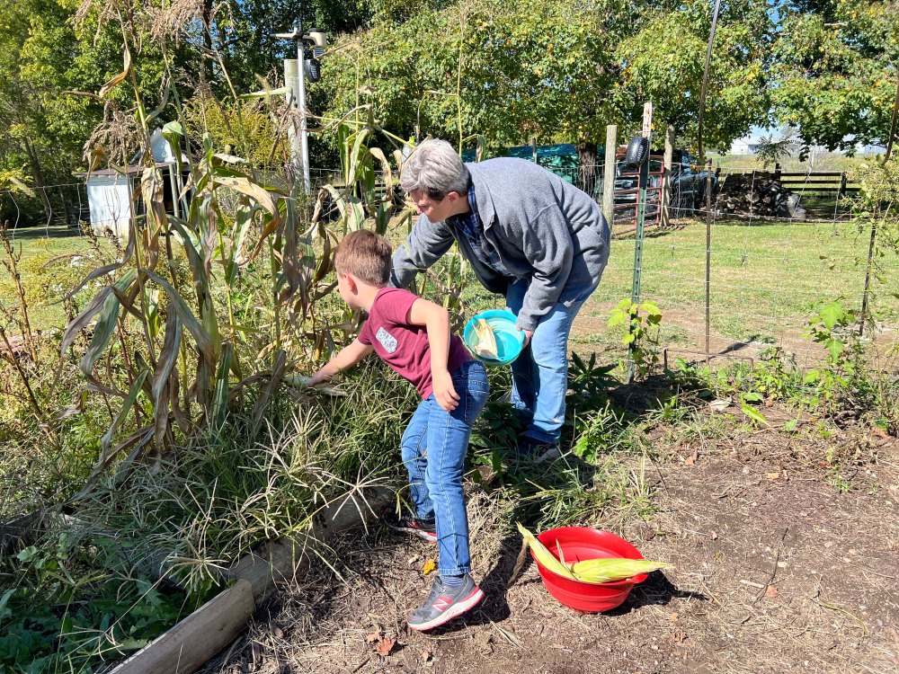 I knew coming in that Oliver has a ton of 6 year old energy so I had planned some activities around the farm on purpose to keep him entertained and hopefully teach him some stuff. We picked the last of the corn, peas, and carrots from the garden, and he and Kyrston shucked the peas for me. Kyrston and I also made corn sheaves and added them to my front yard decoration…super fun.