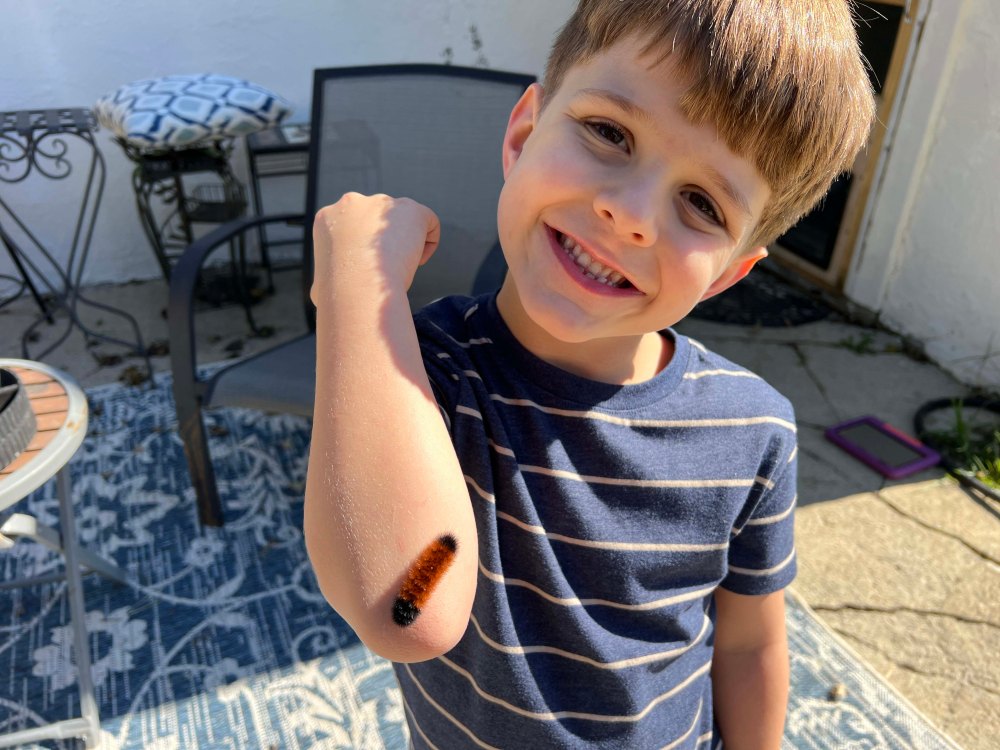 We also fed the goats and chickens every day and gathered eggs along with taking the goats for walks around the property. I tried to take the animal chores in small doses and of course he had plenty of time to just run around the property. At first Kyrston was a little nervous not having him in eyesight, but soon she felt comfortable and he and the dog were wandering everywhere. Dede and Denny also came over one day to see him and another time we carved a pumpkin that we gave to the chickens to eat. Oliver loved that. Lastly we had so many wooly caterpillars all around the door to the house and his job was to pick them up and move them out near a tree. He loved that job !!