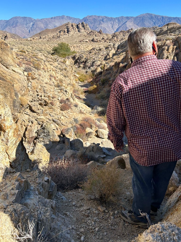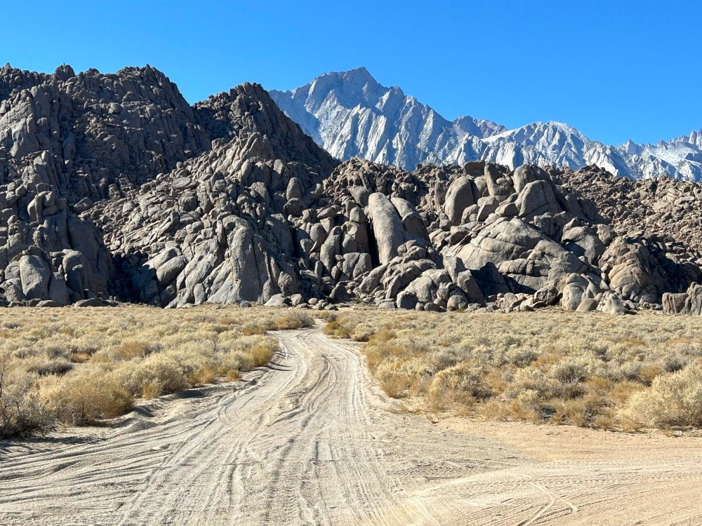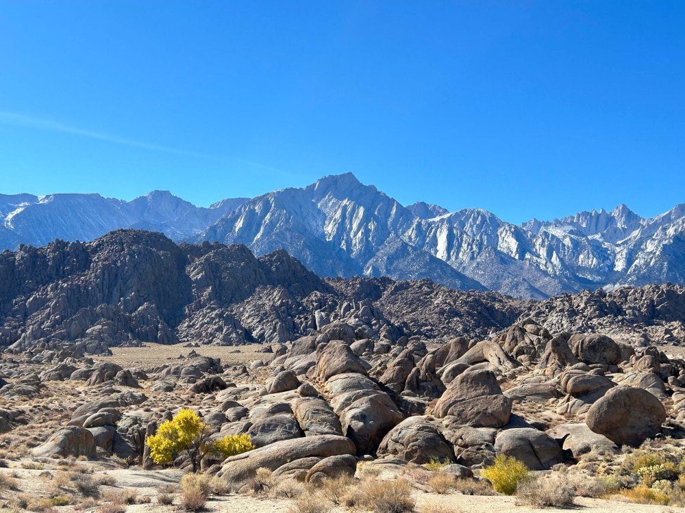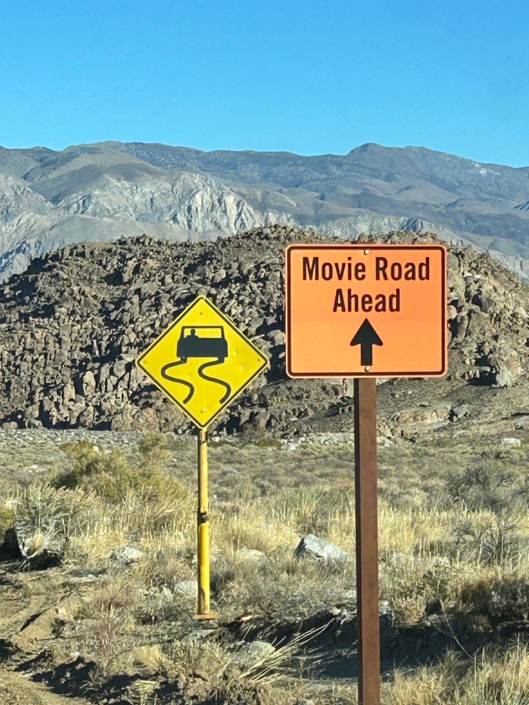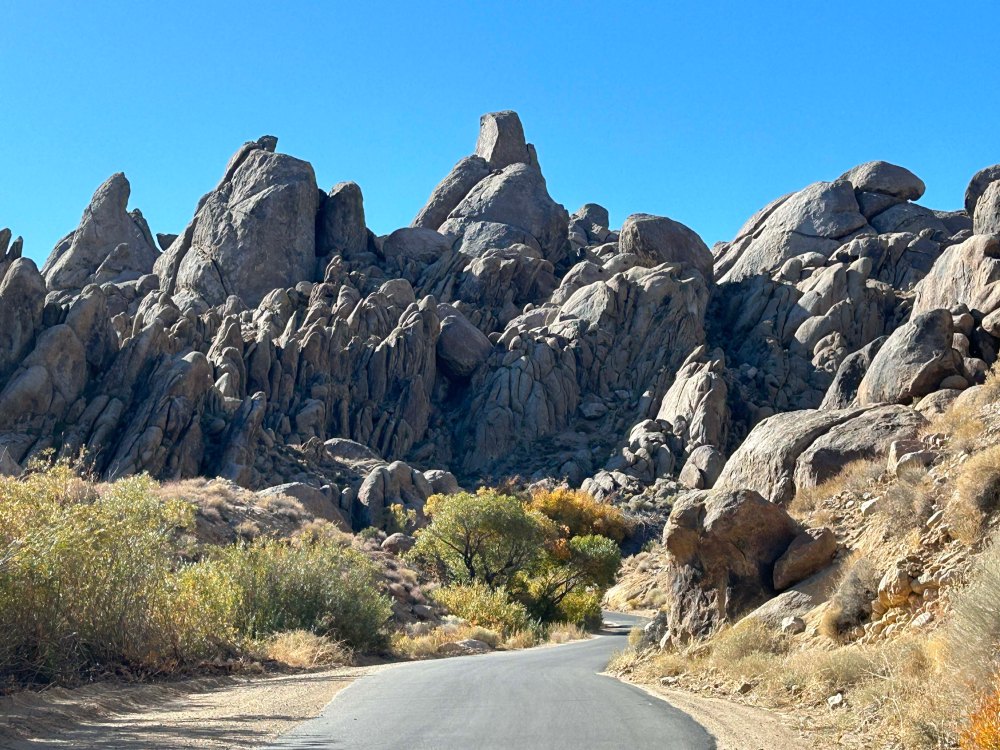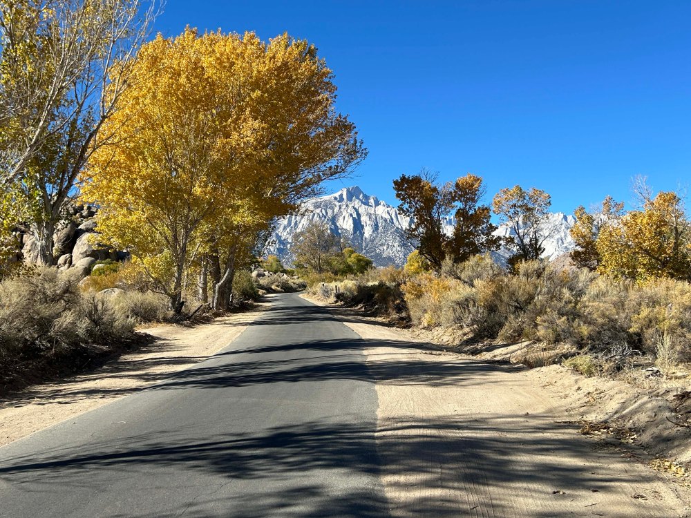 Our next stop was actually really close, and we were excited to see the Alabama hills. There is a “Movie Road” that goes through the hills and we had the coordinates and directions for several areas where famous scenes from various kmovies and TV shows had been shot. Although it is really close to where we are staying, the bridge was being worked on and the road was closed at one end so we had to take the long way around. Actually I am super glad we took this way because there were some gorgeous views along the way. We hit the leaves right at peak and stopped several times to take pictures.