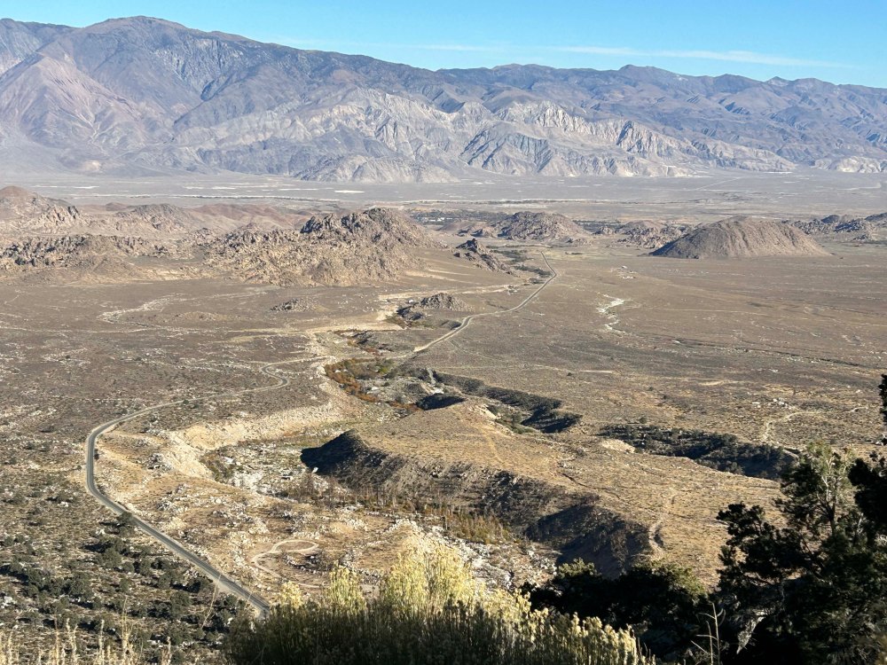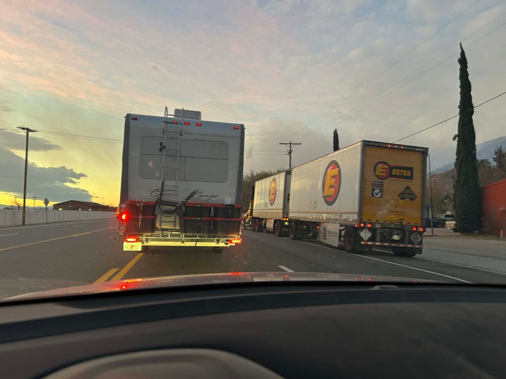 At that point we looked for alternative ways out of the area, but learned that four tractor trailers were flipped over (due to high winds) on South 395 and that road was closed. We explored going north, but would be dealing with snow and it would add hours to our journey, so we decided to try and go across Death Valley despite our concerns about the steep grades on the road. That was not to be however because when we drove down to the road they had it blocked off and we were told we were too big and they would not let us through.