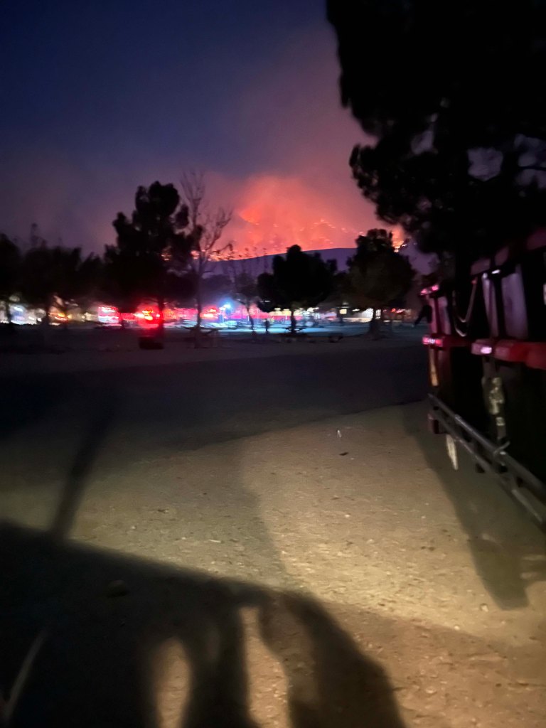 Yes the evacuation was for fire and although it was high in the hills of the Inyo Forest it was very windy that evening and the crews were concerned it might jump the highway. I learned later that folks who lived on that side of the highway were evacuated from their homes and I can’t say enough about the crews who worked the fire and highway safety. Initially we weren’t sure where to go, but they sent us to an empty parking lot in the local sports complex and we all lined up and waited to see what would happen.