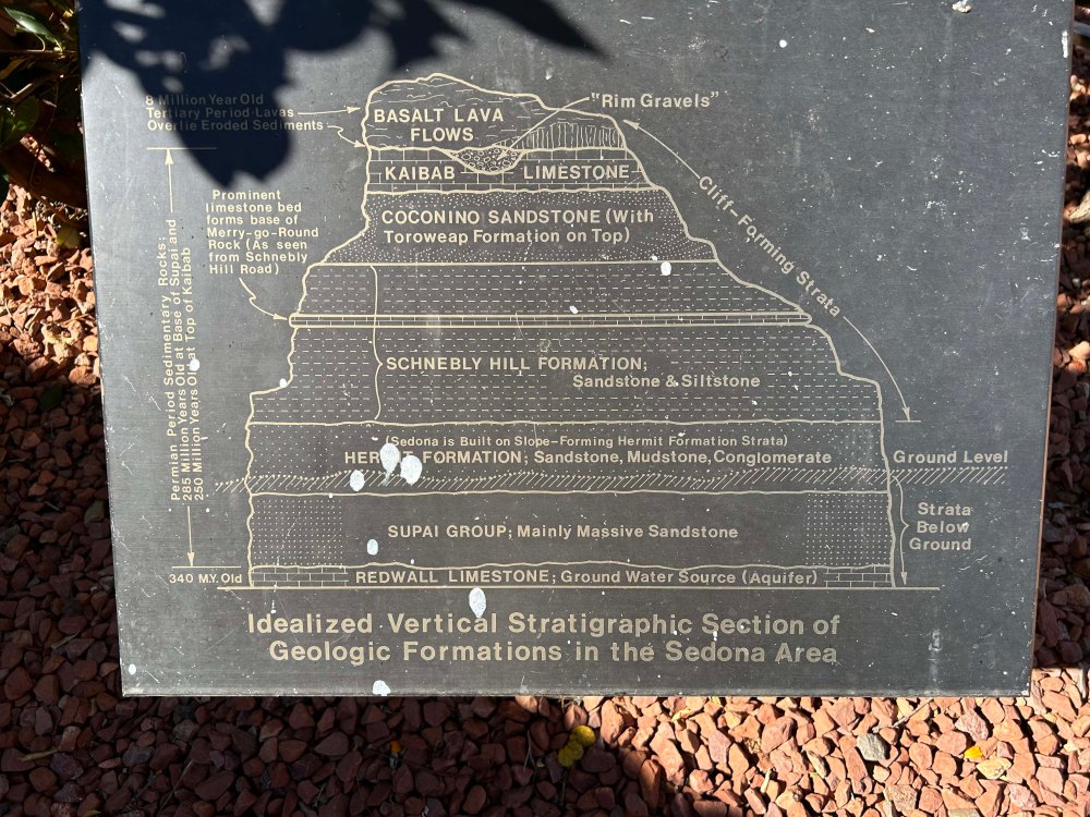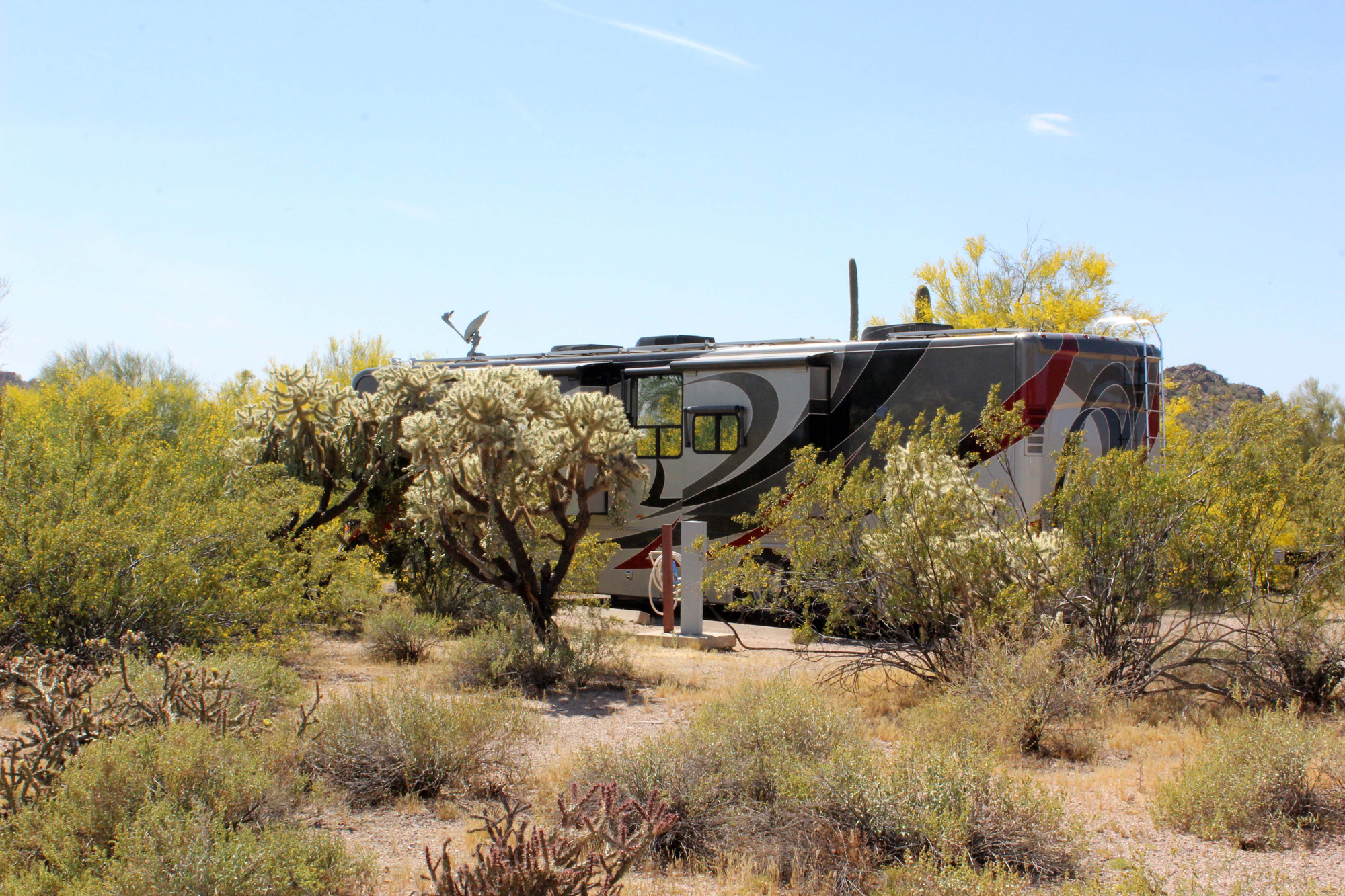 We left at 9am and then headed up towards Winslow. It was another short driving day, only 128 miles, but did include an 18 mile 6% climb, which took us from 3100′ to 7000′! Lee took his time going up the long grade at a very slow speed, but a few others didn’t and we saw folks pulled over because their engines overheated. Our temperature was nice and steady and Lee put the blinkers on, stayed in the slow lane, and took his time. About an hour later I saw a rest stop and asked Lee to pull over so we could eat. He wasn’t crazy about that since we only had 39 miles left, but I don’t like to pull into campgrounds hungry. The setup process can take a while and is not something we like to do when our blood sugar is low, so he agreed and we had a quick-lunch at a very busy rest area.