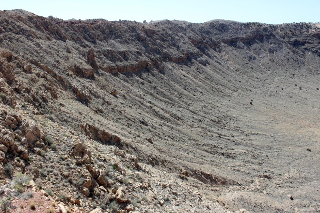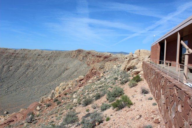 Next up on the Roadside Attraction tour was the nearby Meteor Crater. Lee had stopped here many years ago to see it, but it is much changed since that visit. They have improved the visitors center and added a movie, but they are also now charging $18 a person to get in. We almost didn’t pay it, but I was on a high from our last stop, so we went ahead and went in. It is a cool site, because it is the first crater proven to be caused by a meteor impact (prior to the 1950’s scientists thought they were from volcanoes) and was also used by astronauts to simulate conditions for the moon landings. We enjoyed it and the movie was particularly good, but I still think the price was way too steep. So my advice is if you will only see it as a hole in the ground definitely skip it, but if you are interested in the phenomenon and its historical significance check it out. We found it pretty interesting. Definitely watch the short movie before you see the crater.