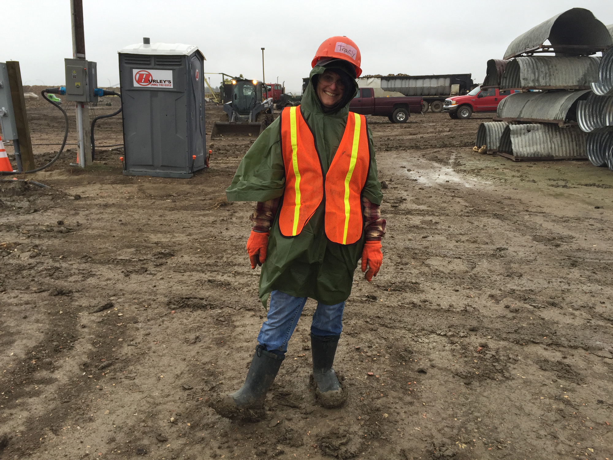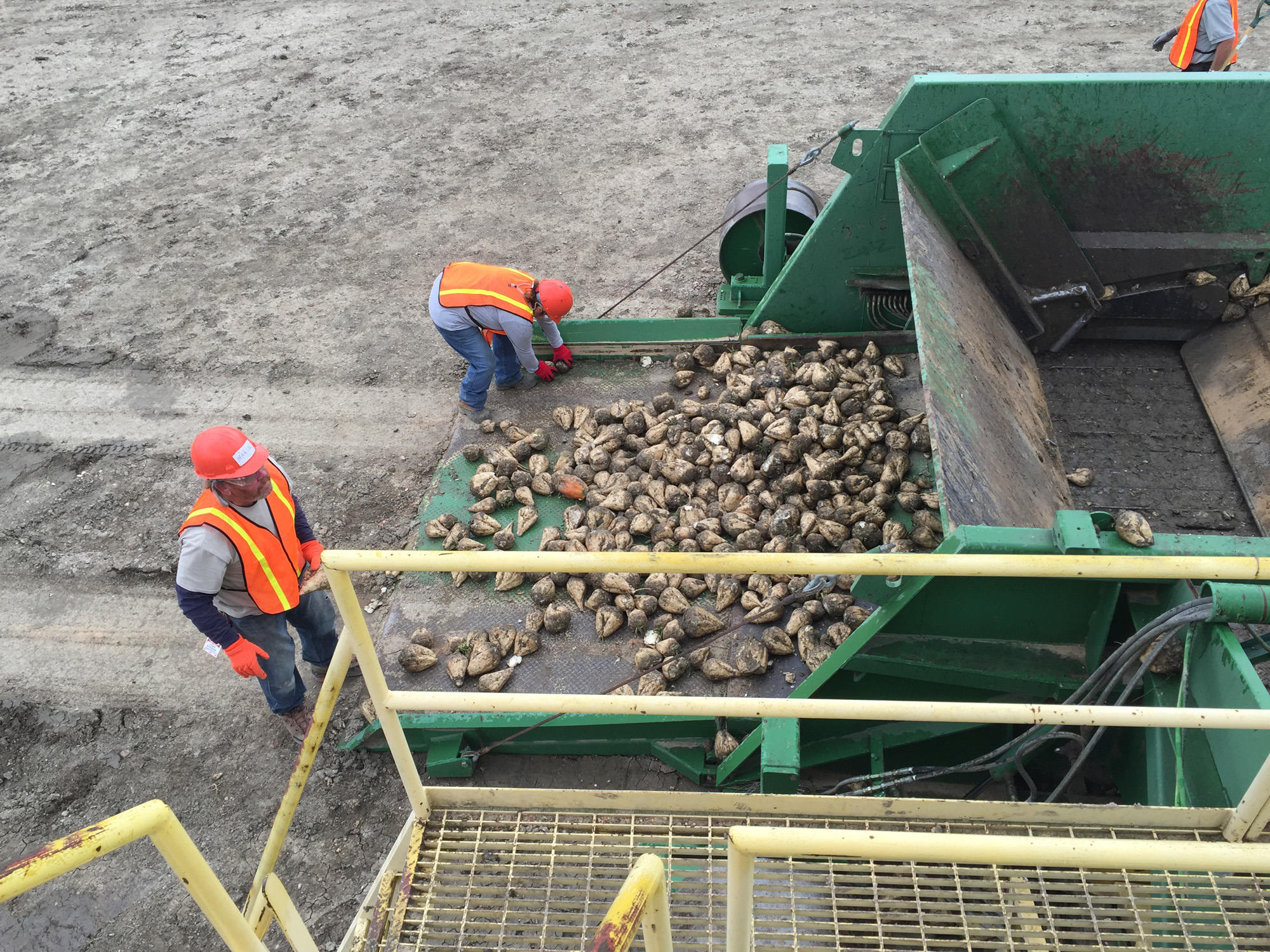 - Work Pace: Overall we processed an estimated 4500 trucks through our piler. (For numbers junkies, a “regular” dump truck, like the green one on the left in the picture below, holds about 35,000 pounds (17.5 tons) of beets, and a long truck, like the one on the right, holds about 65,000 (32.5 tons) of beets. We think the distribution of trucks is about half and half, and when I was counting them, we were doing about 200 trucks on a full day. So our very rough estimate is 5000 tons a day, for a total of about 113,000 tons of beets on our Pilers during the entire season. – Lee) For most of the day, this involved processing a truck every 3-5 minutes. We routinely had lines of 5 or more trucks waiting to dump and had very few periods where there were no trucks at all. Our Piler was shut down for maintenance around 7 hours total for the 21 work days, but other Pilers were down significantly longer, which gave other teams additional breaks. No one ever said work faster or harder, but a supervisor would generally appear whenever there was a slow down caused our line to get longer than usual. Also, the truck drivers just sitting in line waiting (sometimes up to an hour) brought some pressure to work faster. If you are the type of person who can work at their own pace regardless of outside factors, this will be a non issue for you. If, however, you respond to perceived need with an increase in pace, the constant line of trucks can be difficult. My best description of most days we worked (based on my having the latter personality type) was that the pace was often relentless. Update: 2016 broke records for pounds of sugar beets harvested.