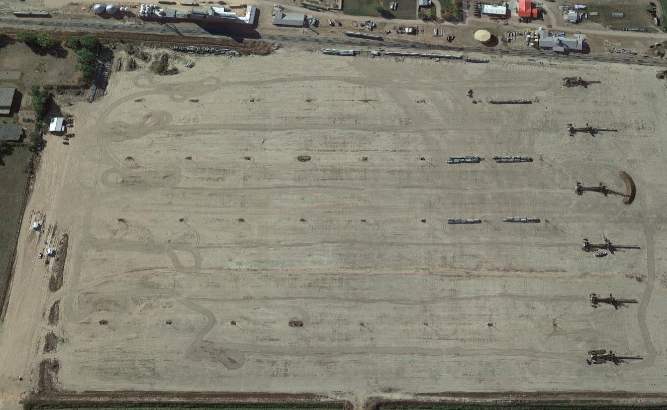 (Those numbers above might be hard to wrap your brain around. They’re just numbers, after all. Here’s a better way to explain it. The picture below shows the piler yard from Google Earth, empty. Well, not completely empty. Let me orient you; the pilers are lined up on the right hand side, where they were at the beginning. And luckily, one of the pilers, #3, shows the very beginning of a pile. The sugar shack is the little white building on the left near the top. The little black dots are the light posts arranged in rows between the pile lanes. That’s also where the power connections are for the pilers. For scale, the little dots at the sugar shack are cars, and the thing below the 4th piler from the top is a long truck. Tractor plus 53′ trailer. The entire piling yard, from the edge of that small pile on the right, to the sugar shack on the left, is half a mile. – Lee)