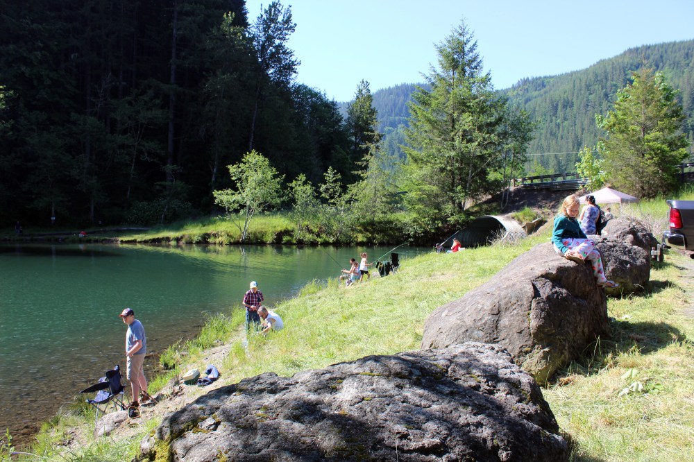 Next is Small Fry Pond and this takes a little longer. This pond is for children under the age of 18, stocked with fish, and is open to both campers from our campground, and the public. The amount of traffic it gets varies wildly, so it requires a morning check of the three trash cans and picking up litter along the trail. It’s a beautiful little path down to the pond, and not the worst way to start a morning, but not so fun on a rainy day because the path is a little steep and can be a bit slippery, especially when hauling out a full trash bag. This area also has it’s own fish cleaning station, which see some use, but thankfully I rarely have to clean it. The evening camp hosts usually check this prior to closing the gate and so far I have been lucky not having to deal with fish guts that early in the morning!