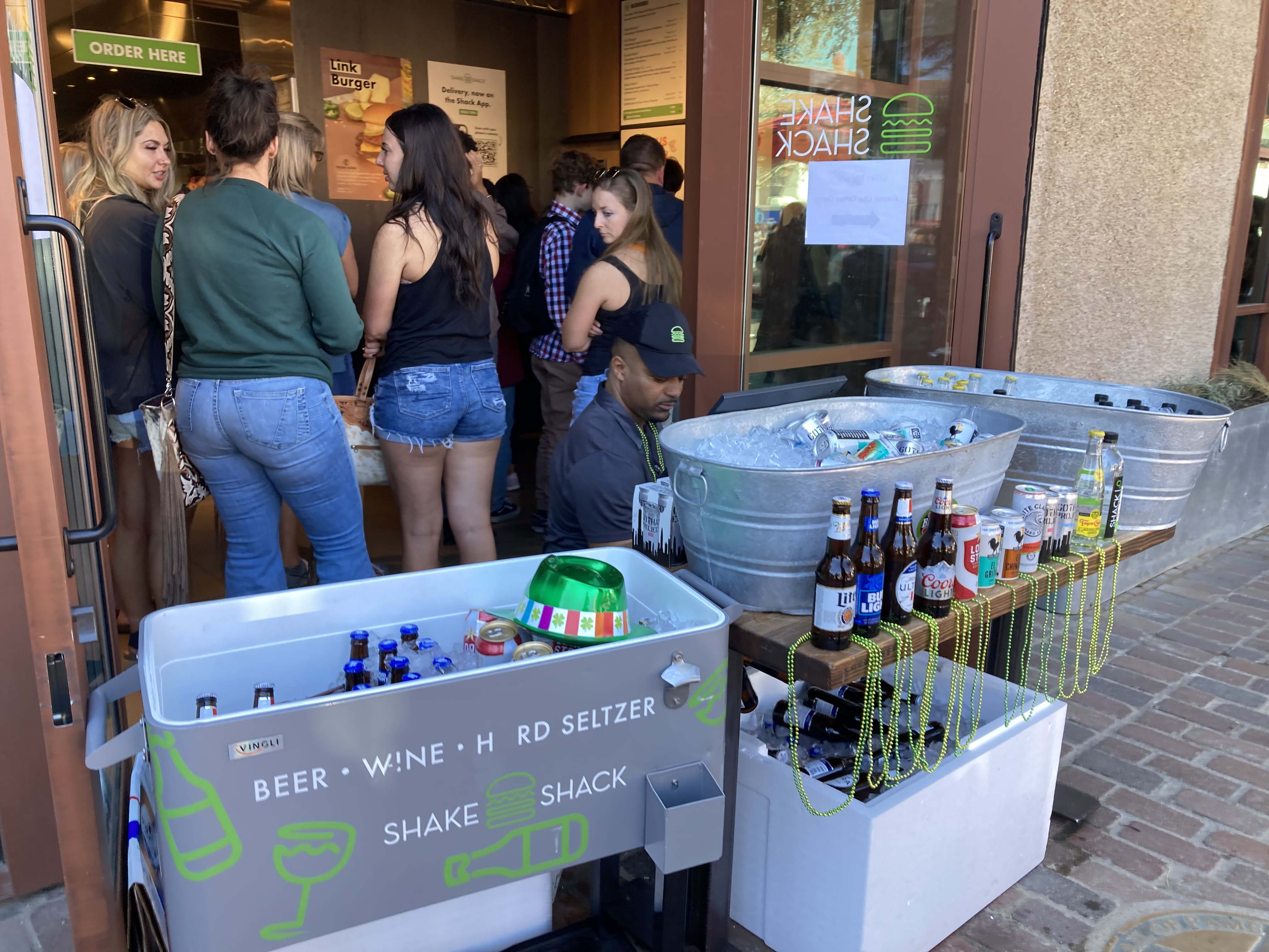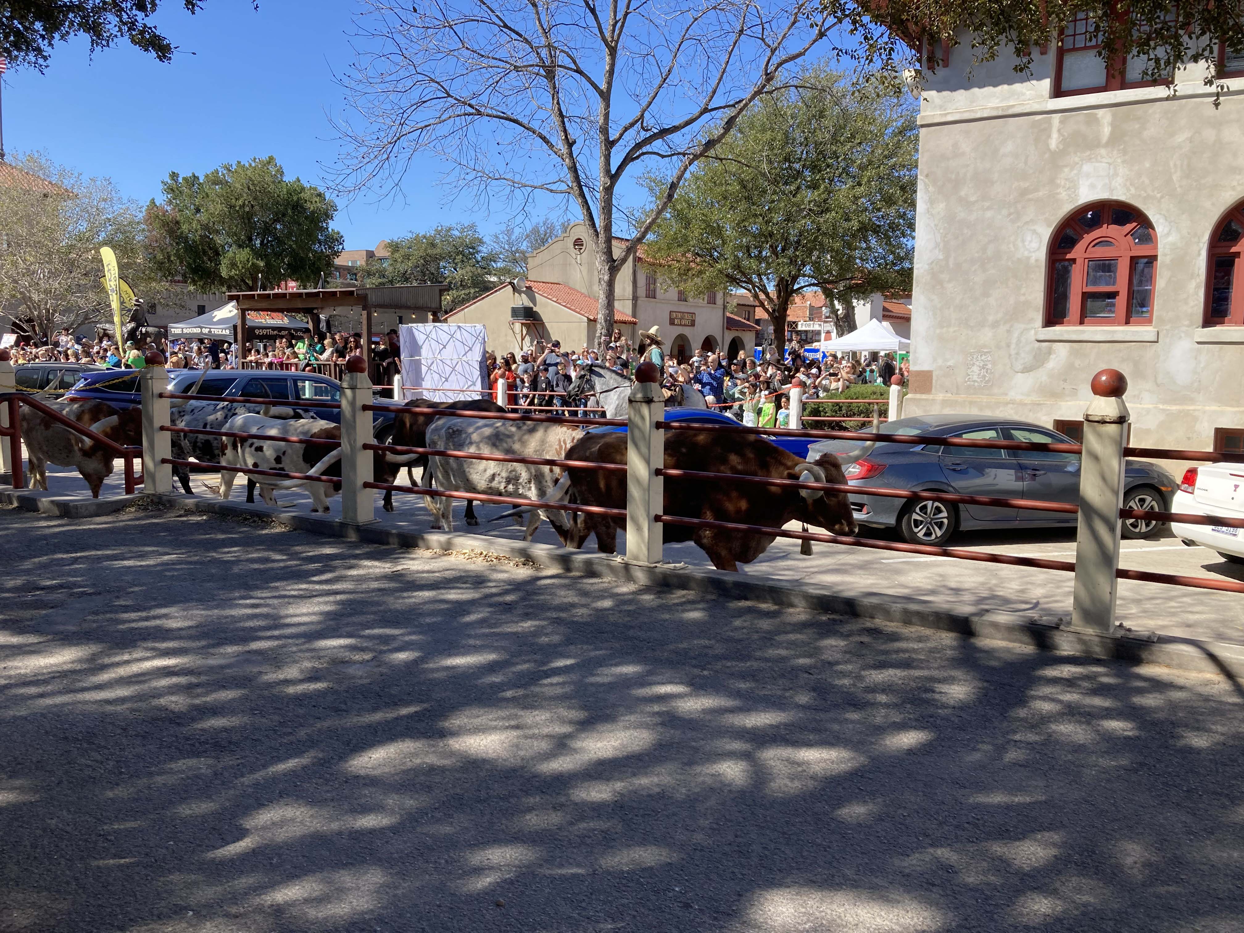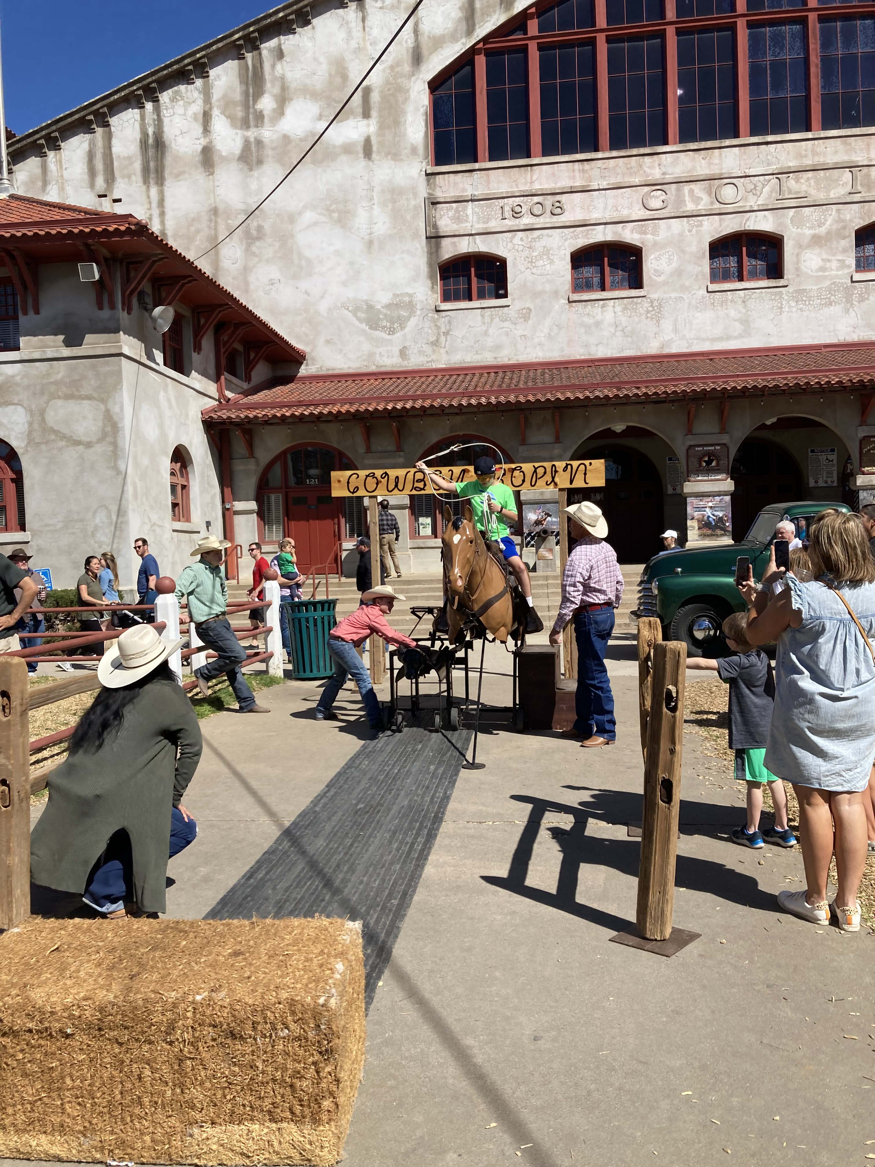 The center square was packed with people and everyone was crowded along the parade route for the crowds. Once they opened it up folks dispersed, but I was surprised by how many families with young kids there were. Once we got a look around though it made more sense. The activities were mainly for kids (armadillo racing, milking a cow etc) surrounded by lots of shopping and bars for adults. They even had a giant TV screen in the central square for dads to watch March Madness while their wives shopped. All the activities were priced a la carte and there were long lines for all of them.