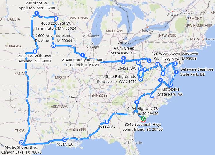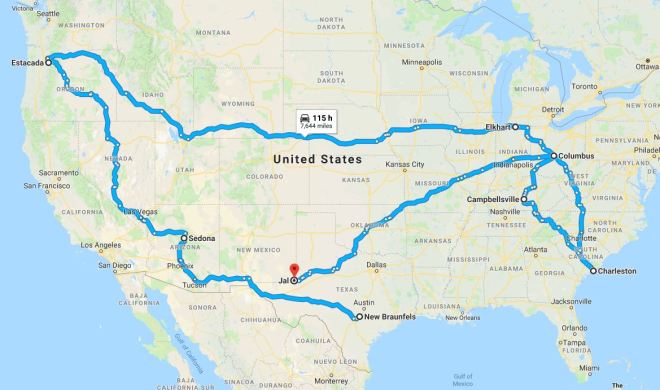 Truck Fuel – This is another category we watch very closely and is number two in overall expenses. This year we spent $5733 and went over our annual budget by $933. Although the expense was less than last year, that was expected because we didn’t have a trip to Alaska, and was definitely more than we wanted to spend. It’s pretty easy to figure out why when you see our driving route for the year and we know we simply can’t afford to keep criss-crossing the country every year. That’s going to be tough because our family is mostly on the east coast, but we love traveling in the west, but we have committed to not going back east (barring family emergency) for 2018 at least. Our financials also includes leaving Cambellsville, going to Columbus, and then heading back to Texas. Here is a rough sketch of our travel schedule for calendar 2017. Looking at it this way it’s easy to see where the costs came from. (I find it very funny that we started in New Braunfels, TX, traveled 8,000 miles, and ended up exactly one year later only 400 miles from where we started. – Lee)