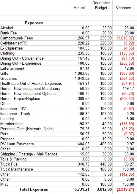 Truck Maintenance – This was another category I was very happy with as we hit a three year low spending only $721. Expect this category to rise next year though as we have used all of our pre-paid maintenance and will need to pay out of pocket going forward. We still have some time on the warranty in case anything major happens, but maintenance is on us. Lee and I will need to sit down and estimate when those maintenance activities will occur and then come up with a budget going forward. I’ll have all the budget amounts updated in our January budget report and will talk then about how we made certain decisions.