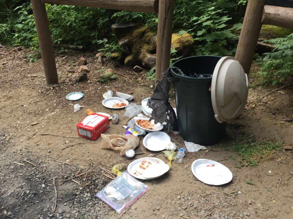 Sunday was hot again, manageable but the humidity was a bit of a challenge. Plus the smoke was back and air quality wasn’t that great. On the plus side, folks have been leaving me little bags of recycled cans all week along our route and I set a new recycling record with over $39.60 in cans. Not all the trash can users are so nice of course (see picture below from one trash can this weekend, but I have definitely seen an improvement overall and I do like getting those “presents” if recyclables.