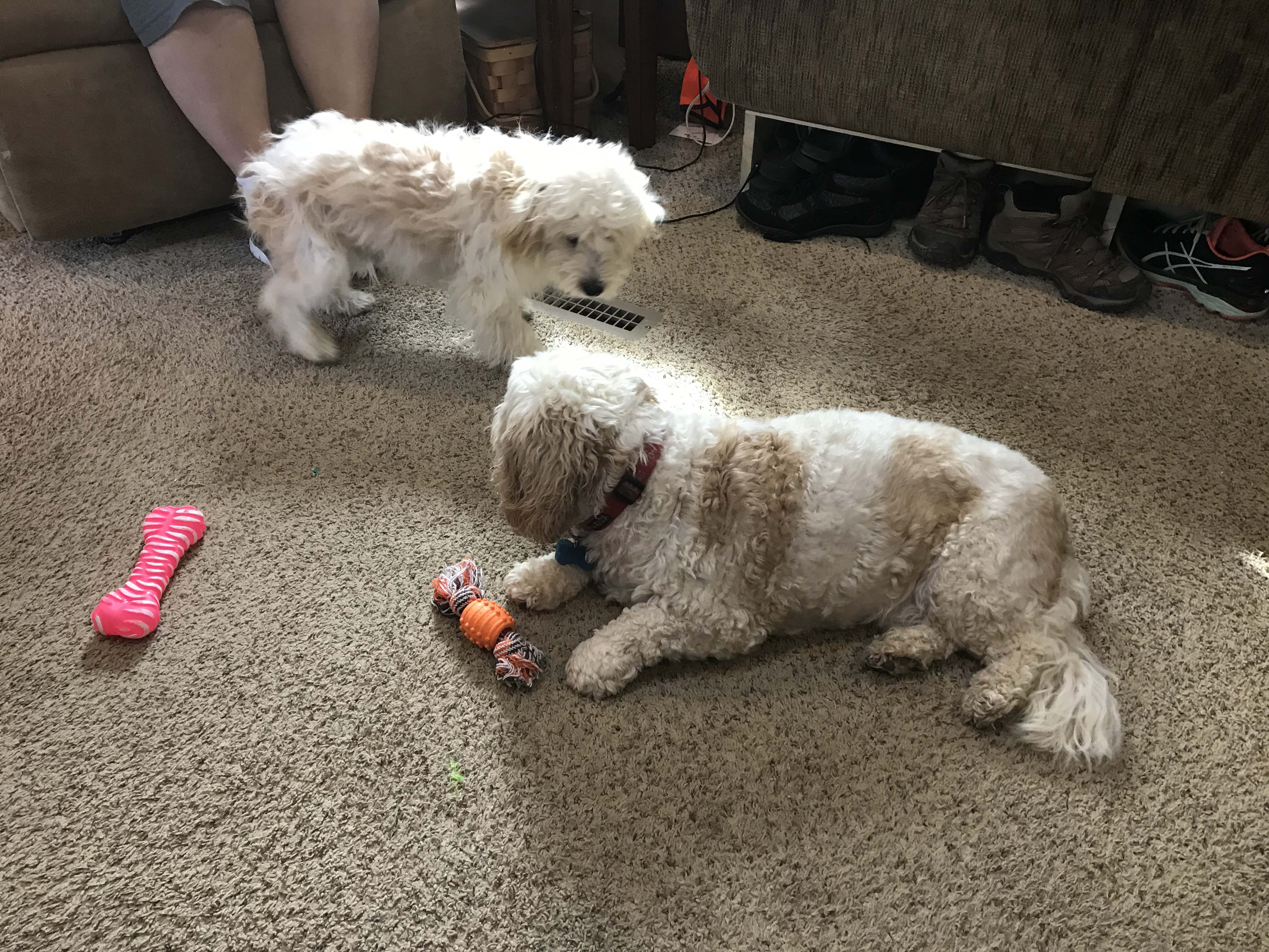 The thing that I liked the most was the owners let us take our time. They were in the house with us, but didn’t talk unless we had a direct question and just let us get a feel for the dogs. The smaller male had more cavalier characteristics and was more of a lover. The bigger male had more energy and seemed more bischon, and they both seemed active and healthy so it came down to a matter of preference. After a little while I asked to take the larger dog outside and we went and ran around a little. Initially all the other dogs came out to and it was a complete fluff fest.