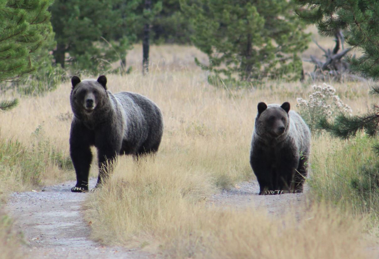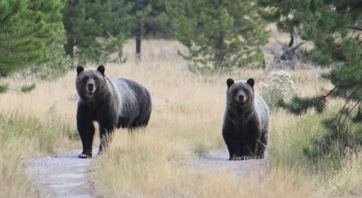 The road by the way is variable. Some is paved, some is oiled dirt, and the closer you get to the Canadian border the rougher it gets. It was definitely manageable in our truck though and we saw several smaller cars going by. It is super bouncy towards the end though, which is kind of a good thing because it forces you to slow down and really look around. We were all on animal lookout of course, and Steve was dying to see a grizzly bear. We had made a joke that he tipped the ranger $15 to see a bear and kind of our running theme was “would we see bears?”. As we were driving along and looking at the beautiful views we came upon a really nice house, at a point in the trip where for a handful of miles it was private property as opposed to public land. There were some private residences on the edges of Glacier and as we were looking at one of the driveways I saw what I thought was two bear statues or plywood cutout silhouettes. After my brain registered what I was actually seeing, I told Lee to stop, and he backed up, and holy cow there were two huge grizzlies right in the driveway!!! They were looking straight at us from about 75 feet away and they stayed for a while until Steve got out of his truck upwind from them and they decided to wander off. It was truly truly an amazing moment, one I will cherish forever, and I definitely felt it was the universe’s way of saying, “yes this is tough but look at what you get to see…you are on the right path.”