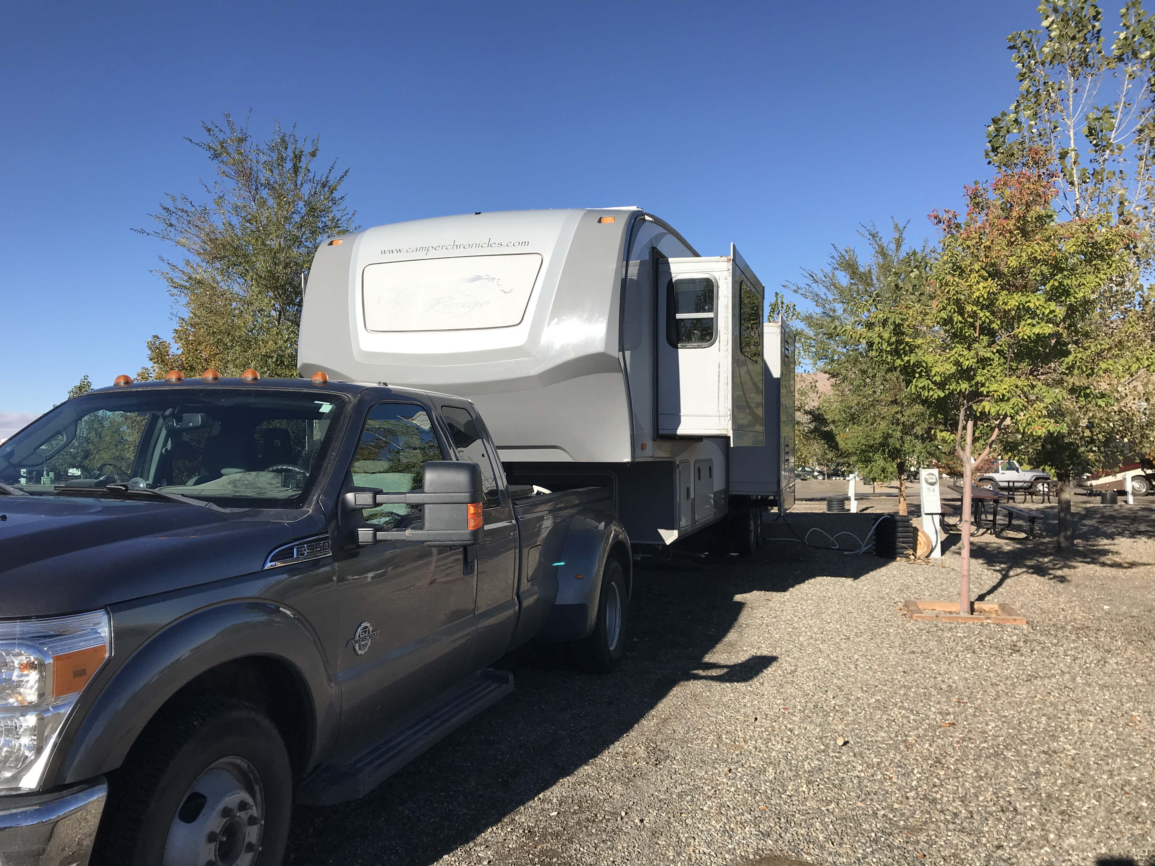 We got a late start (for us) heading out of Timothy lake around 9:52, because we were extra careful to double check everything before pulling away. One thing we have noticed is the longer we stay in a place the more likely it is we will forget something when we leave, and we wanted to make extra sure that didn’t happen to us again. Just a few days prior Lee had noticed that two of the nuts which secure the bolts which hold the hitch rails to the bed of our truck were missing. That was a little scary, especially coupled with the fact that the other bolts were very loose, and really drove home the fact that we need to be checking these things. Lee was able to pick up replacement nuts at the hardware store, and thankfully everything else looked good and we were on our way.
