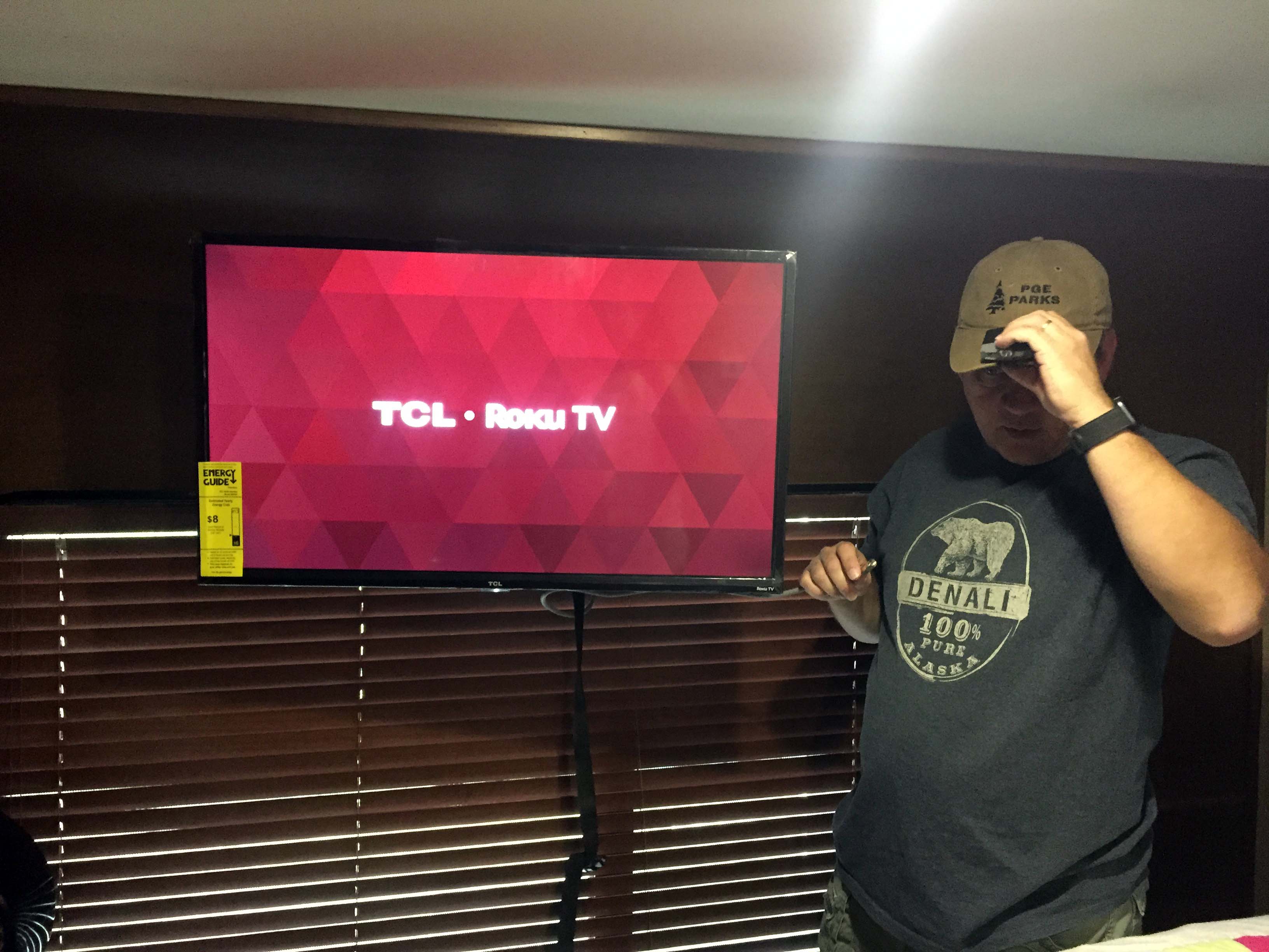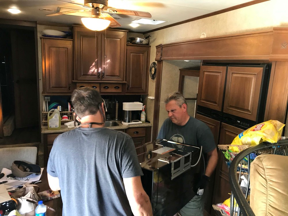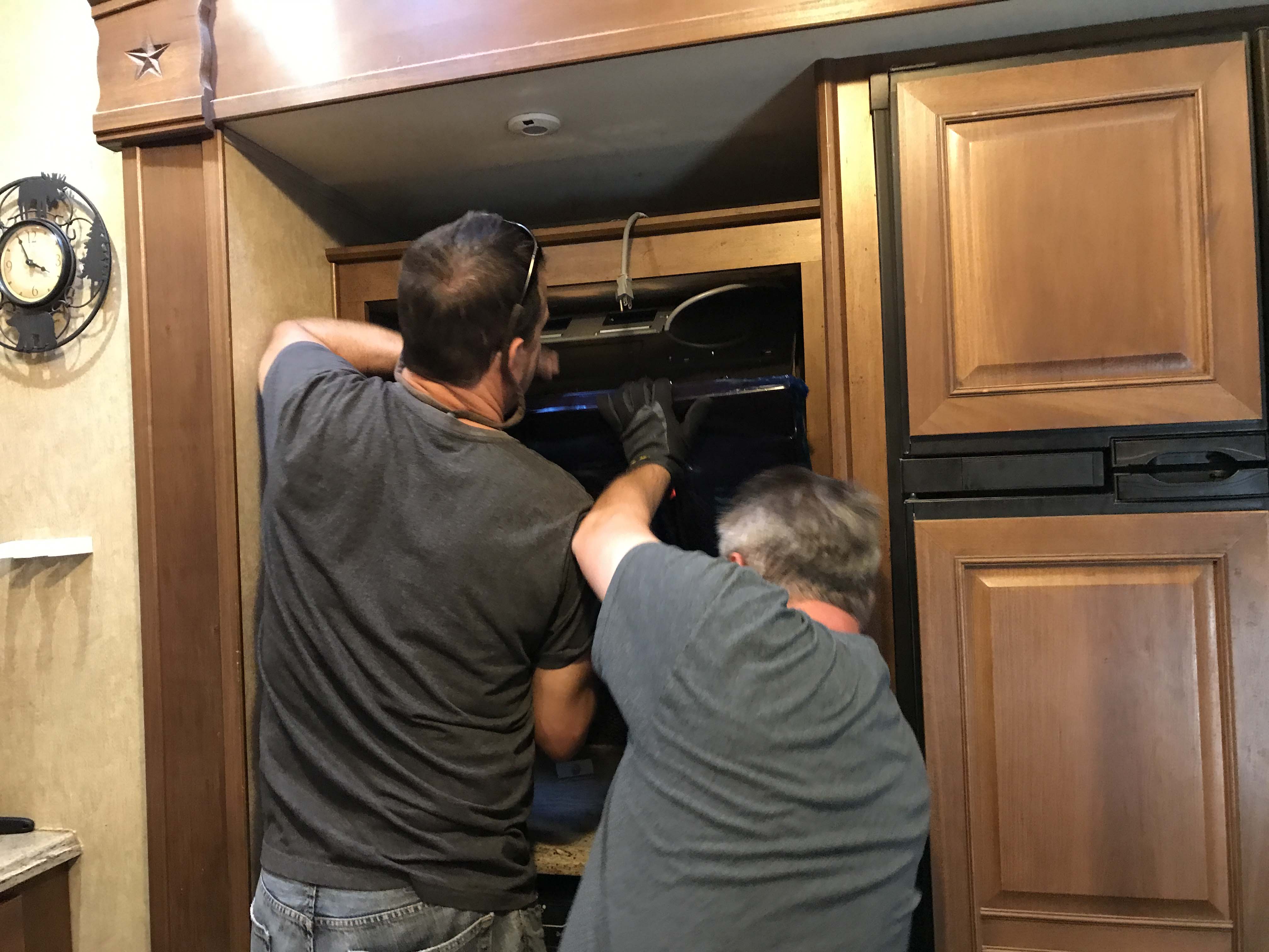 Then I hung it up. Most rigs will have some wood framing around the AC hole in the ceiling, but check to be sure, otherwise the screws will just fall out of the thin paneling of the ceiling. Also be sure to avoid hitting any wiring with the screws. Use the shortest screws you can, and make sure you’re going into wood and that will keep you out of trouble with the wiring.