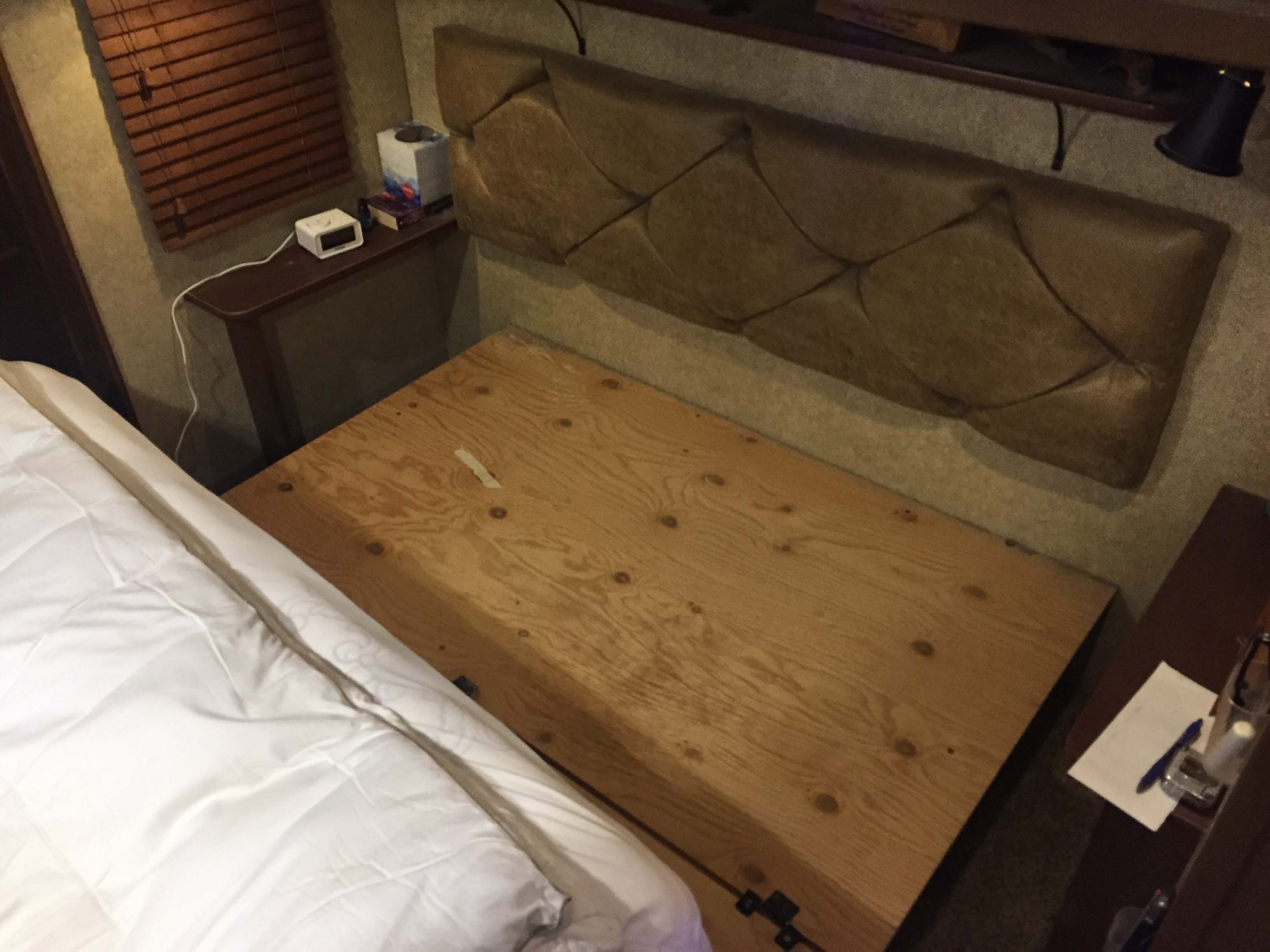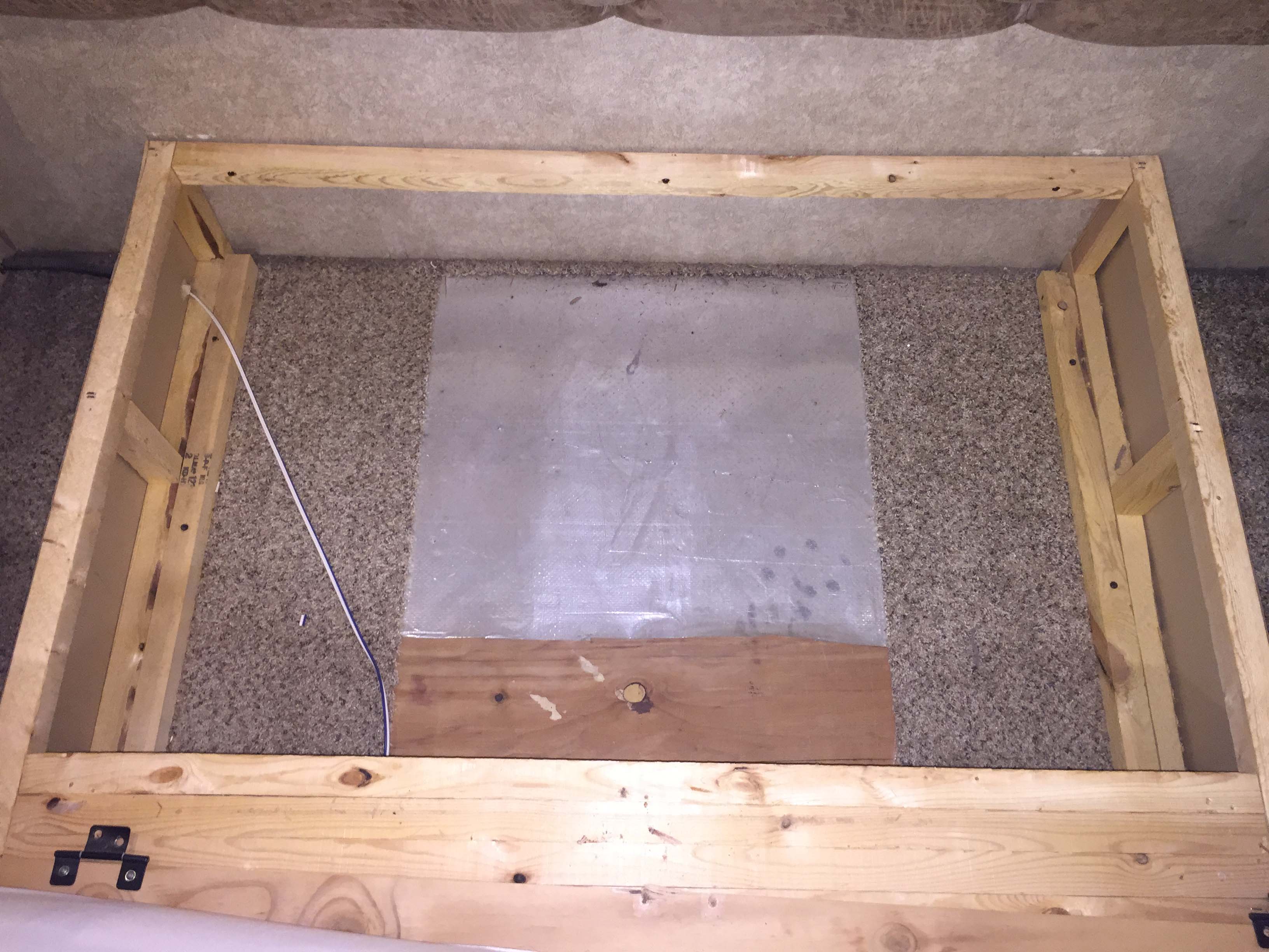 Although we drove 1200 miles with this in place, the magnet never pulled away from the metal plate. But even if it had, it would just swing harmlessly down. When it’s “closed” the bottom of the box is 92″ from the floor, which is plenty of clearance. In our rig, when it’s “open” it’s still 75″ from the ground. And because it can be opened, the “dump” valve is still available to us, which is nice.