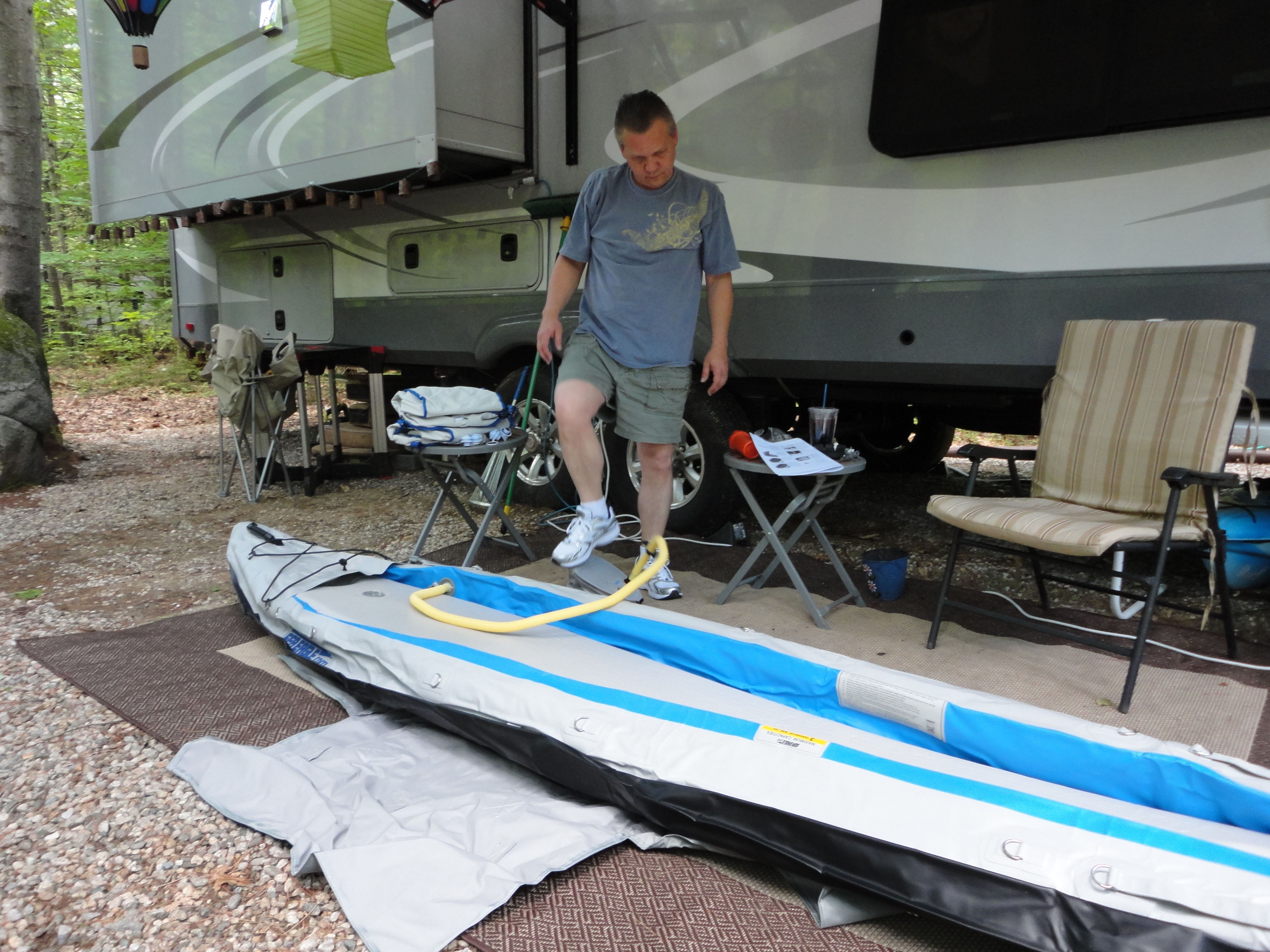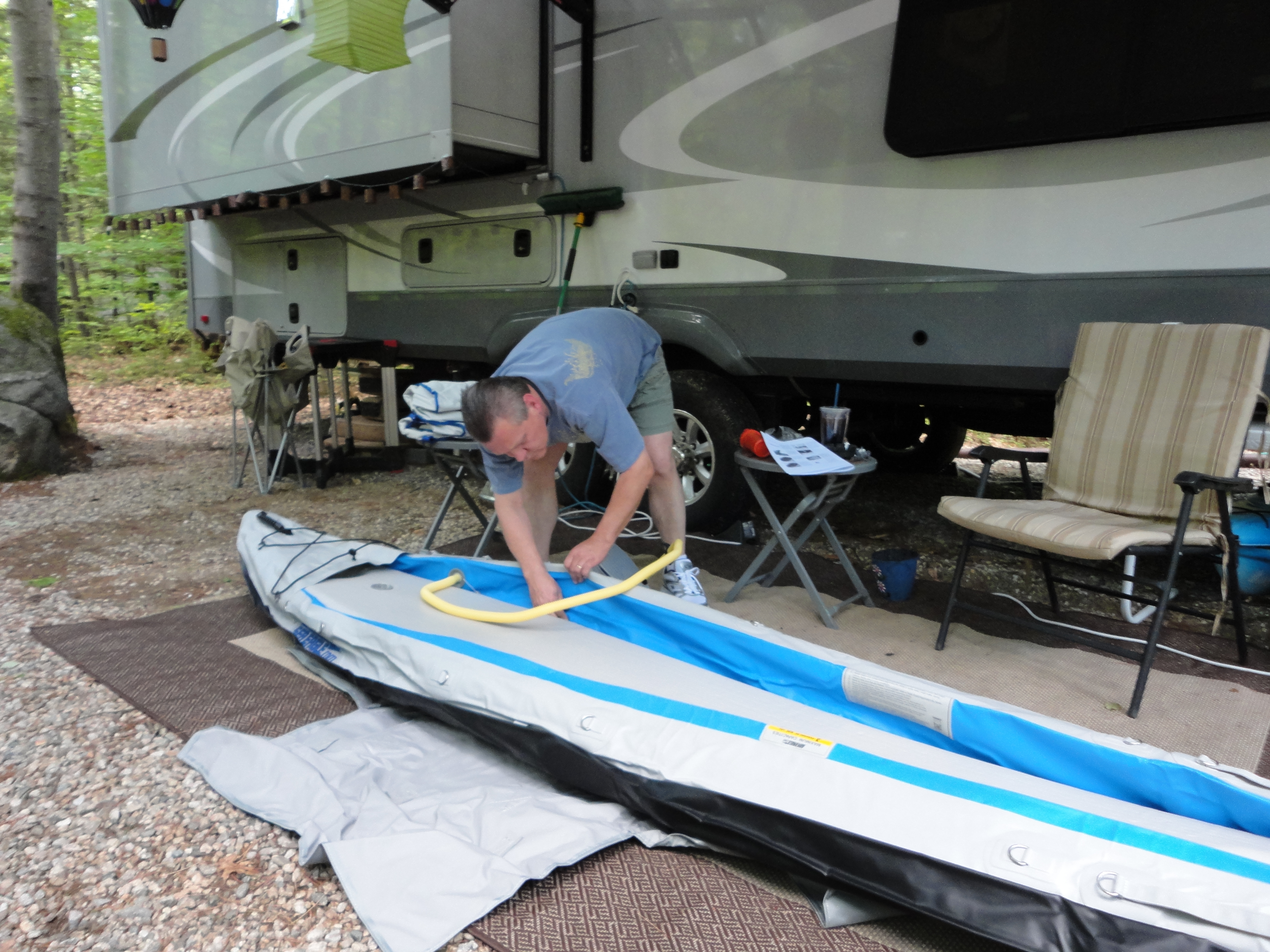 Speaking of being stationary, the campground had lots of tent campers this weekend. As a general rule these folks are on the quiet side, but a big group took over all the spots and they were pretty loud. I guess I was spoiled the last couple of days but really not the noise. In the end we went inside and watched a movie. Double pane windows are WELL WORTH the investment. Turn on the AC and you can’t hear a thing. I feel bad because they were nice people… one of them came over and complimented us on the rig and truck. As a side note, Lee gets a lot of compliments on the truck . That’s still funny for us because we are not truck people and for us the truck is simply a means to an end (ie: pulling the 5th wheel) . Neither Lee or I would ever have one (especially not this big) if we weren’t camping. But guys sure like the TRUCK. TRUCK in capitals because it’s a monster Ford F350 Dualy. (But it’s pronounced CHRUCK. – Lee) The point is I can’t blame them…technically they aren’t breaking any rules and they are having a good time, but it bugs me that we can’t just move. For me this is one of the most serious drawbacks to having a seasonal site. Now if we picked one with quieter neighbors and no drop in sites near us, it would be better, but unless you have friends staying in the same campground, you don’t really know what a particular site will be like until after you have committed. I also wish the campground owners would do a later drive by on the weekends. The last time I saw our security was 9:30 pm on Saturday night. Obviously a later after hours sweep is called for. We have found a solution…windows closed and fan on…but its a bummer we can’t sleep with our windows open because of the noise. I have decided though to take matters into my own hands a bit. Turns out we have outside speakers and my blue tooth on my phone syncs to the radio in the camper. Now under normal circumstances I would never play my music outside, but I may have to send some Celine Dion into the air if these folks don’t calm down a bit.