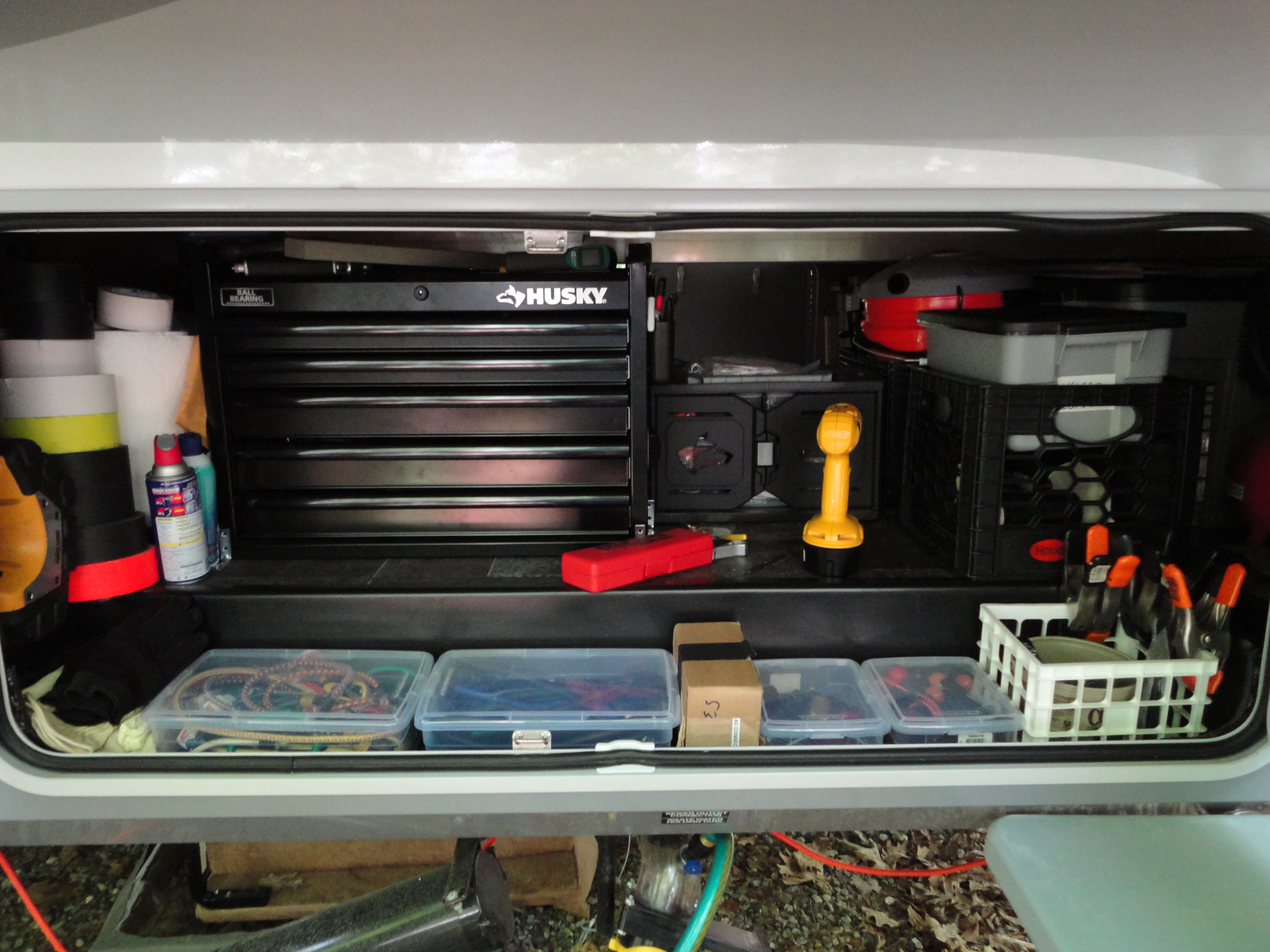 Much quieter here as the Monday holdovers have left. The birds are once again chirping and the chipmunks ar scampering. Seriously, Jack and Jill have taken over the campsite. They run everywhere and give us reproachful looks when there are no peanuts. Lee found the opening to their den in a tree trunk behind the big rock on our site, so technically I guess it is their site since they live here and we are just renting the place. It was super humid again though today. I turned the AC on around 10:30. I did get quite a bit of work done. Had some productive calls and I could really focus because it was so quiet. We had leftover ribs and slaw for dinner…even better the second day. Then Lee helped me organize the cabinets. They were making me nuts because the things I needed the most were always on too high a shelf and we didn’t always know what we had. He organized by frequency of use, placing the most used items on the lowest shelves so I could grab them without standing on a chair. He did a fantastic job and but I’ll let the pictures speak for themselves. I am open to hiring him out for a minor fee 🙂