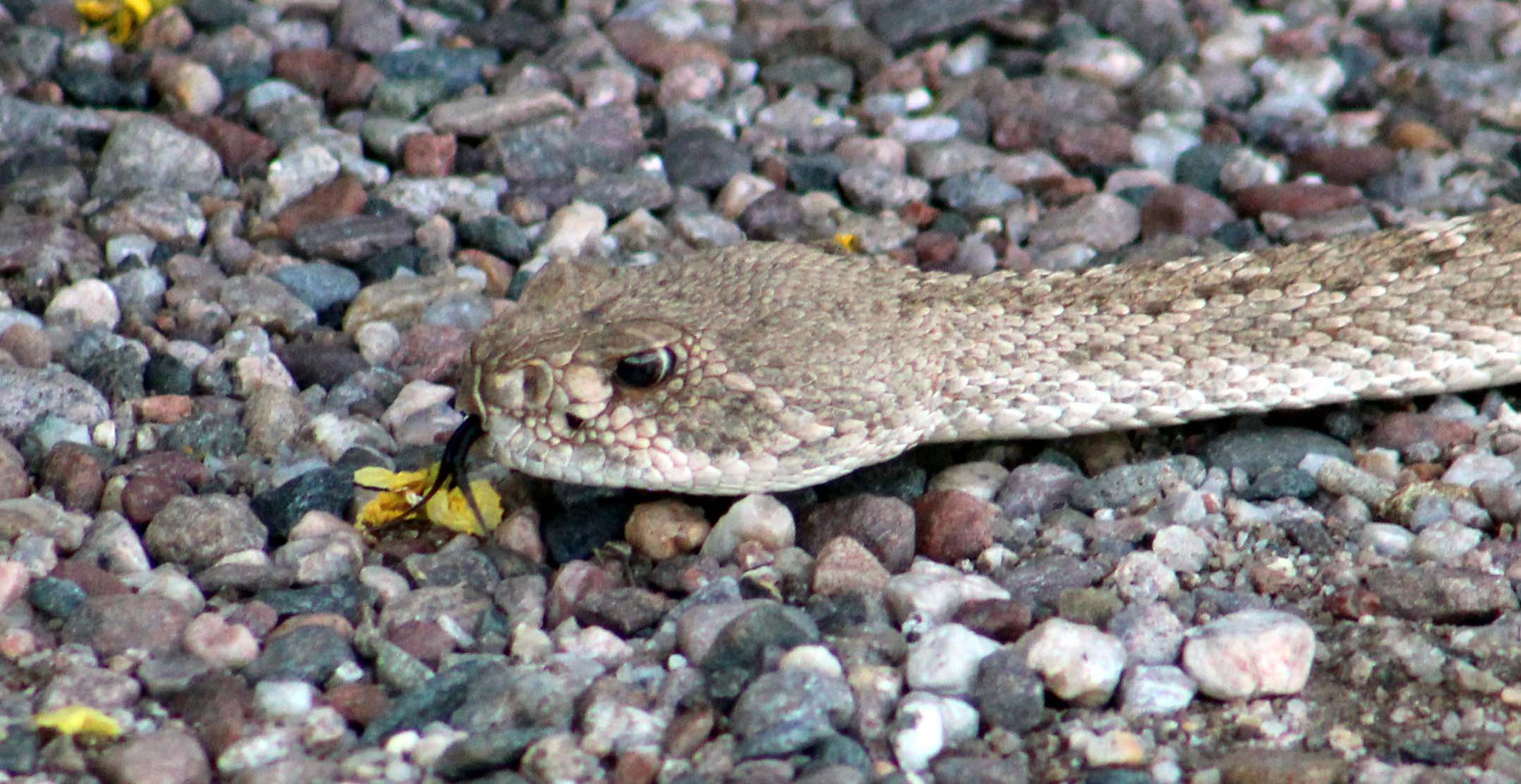 The diamond pattern on the back shows it is a diamondback. I didn’t even notice until Lee pointed it out. Too busy looking at the head where the fangs are.