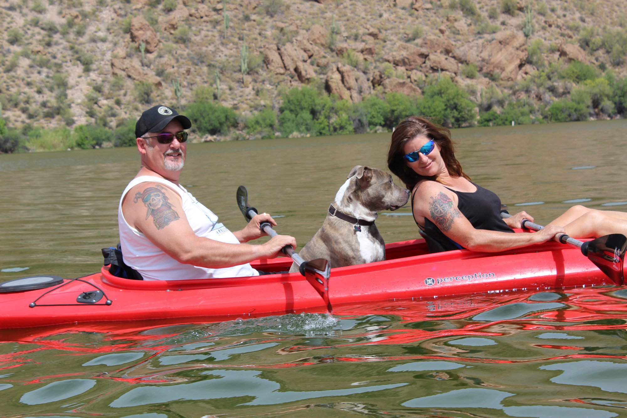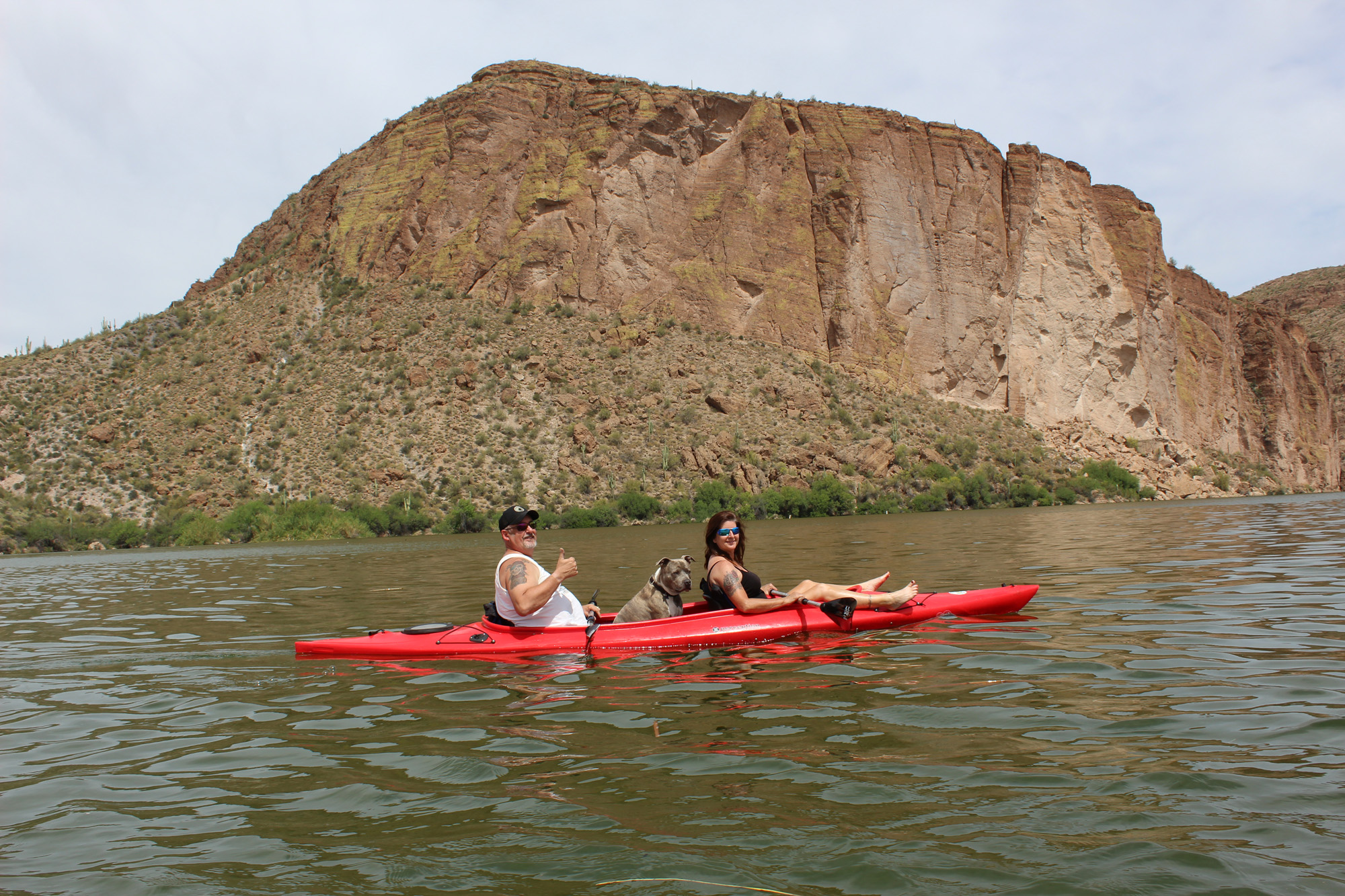 That night Steve, Deb, Kat, Bert, and Lee and I all ate together, but everyone just brought the leftovers from their fridge. This is a fun way to eat, and everyone feeds each other, so I gave Steve leftover hot dogs, Bert fed Deb chicken legs, and Lee ate leftover steak. Meals like that always manage to come together and are a great way of cleaning out the fridge. We had a fire and talked some more and then called it a night because Saturday morning we were going kayaking with Deb and Steve at Canyon Lake. We have an inflatable Sea Eagle Fast Track kayak which is great, but for one reason or another we barely get to use. Deb and Steve use their kayak pretty frequently and wanted to show us a special spot they found. We got up early and left around 9:15am after saying goodbye to Kat and Bert. They had an all day family event and we weren’t sure we would see them before we left. So glad we got to hang out though, and know them better, and they may be heading to Oregon this summer, so hopefully we will get to see them there also. Either way, once you connect with people it’s easier than you would think to meet up with them in your travels so I know we will see them down the road.