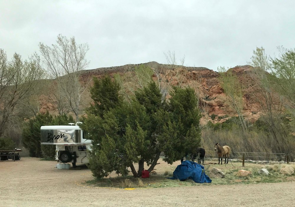 (The pan is actually designed to go under a household water heater and catch drips and leaks, but I bought it to use as a soaking pan for our giant round fire pit grill, and the grill surfaces of our Weber Q grill. All of those are large but not tall, so this was the perfect way to soak them. But, I haven’t used it in over a year, so it was going to be purged. – Lee) The next morning we woke up and were pleased to see the solution had held up overnight. It was still windy and actually a bit colder and I was really over the weather. We knew that our first 10 days the weather was almost perfect and we were overdue, but it still sucked. I really needed some time to get caught up on blogging before moving onto Moab, so we decided to just drive up to the Four Corners Monument and step on the square since we knew from talking to other people that was a “ten minute thing”.