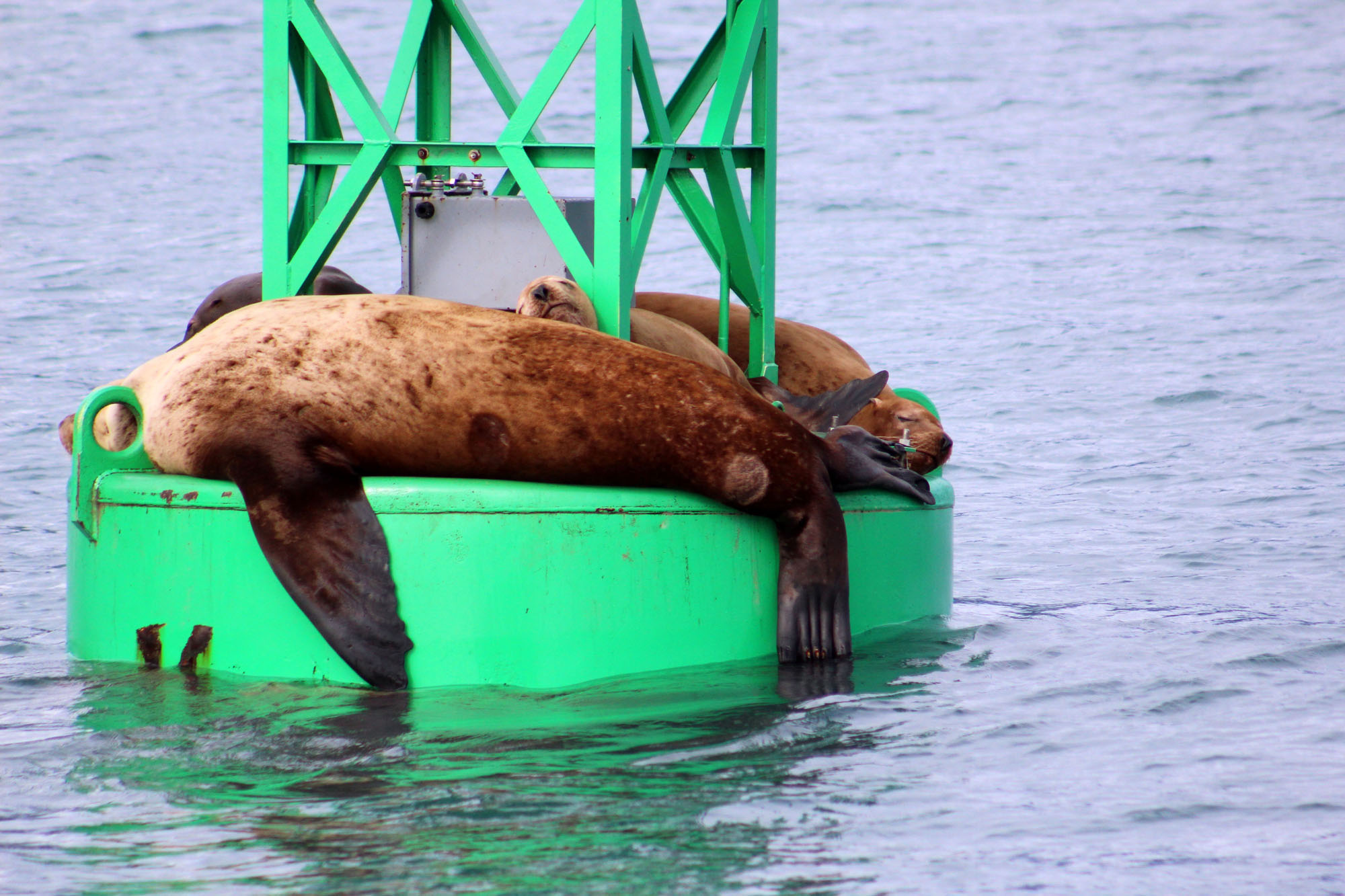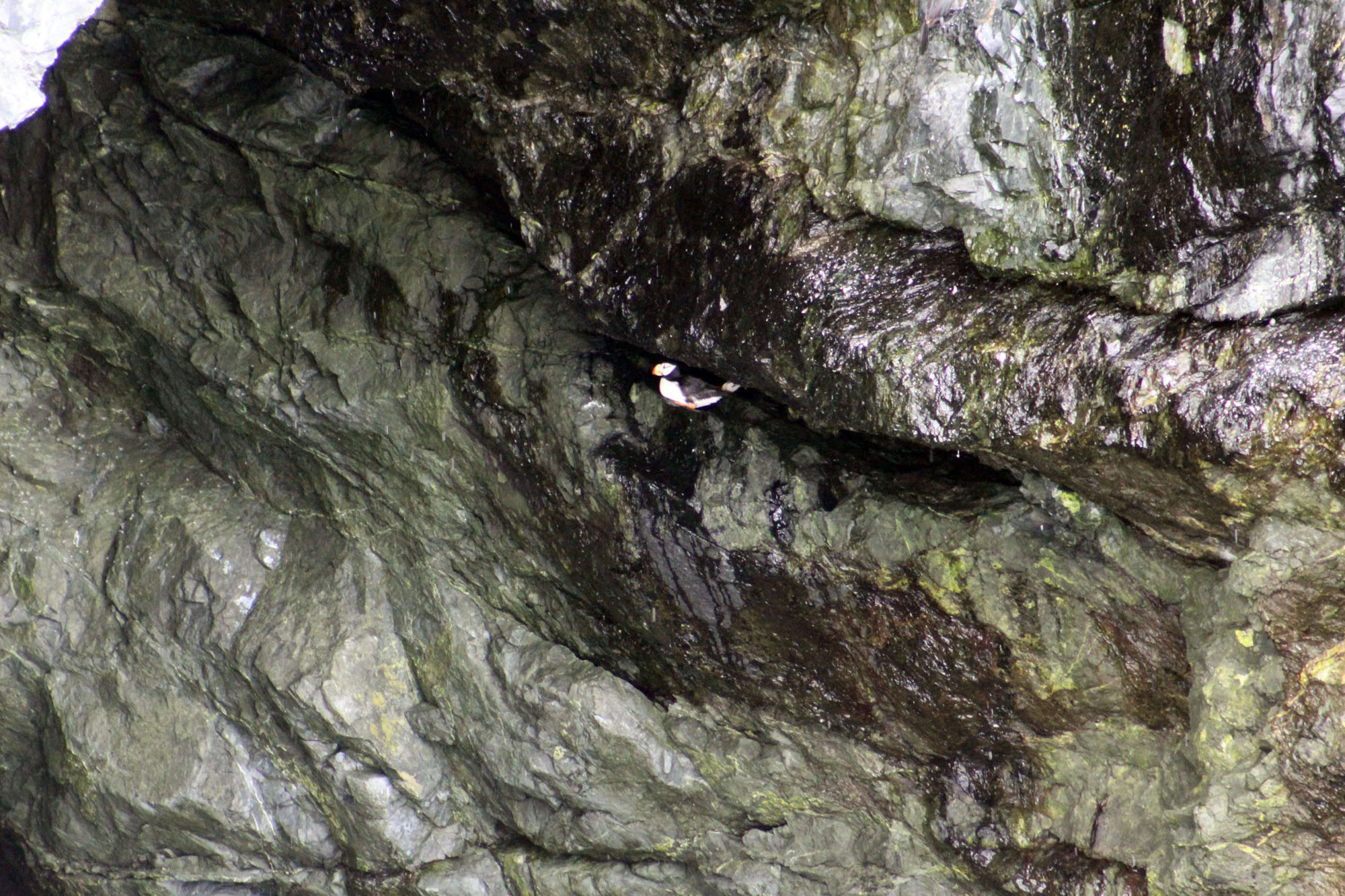At this point I think we were all a little bummed, but the captain had one more trick up his sleeve. He took us a little farther out on the way back to an island where we saw lots of stellar seal lions and puffins!! Unlike the California seal lions the Stellar lions don’t really bark, they just growl and there were tons on the rocks. Unlike sea otters they can’t sleep in the water so they need to find land to sleep. And flying all around them were TWO kinds of puffins. Those little guys fly poorly and super fast so they were very difficult to get pictures of, but I got one of each kind (tufted and horned) and added two new birds to my bird list. That in and of itself was worth the trip for me, especially because the horned only come in during mating season and generally live on the high seas.